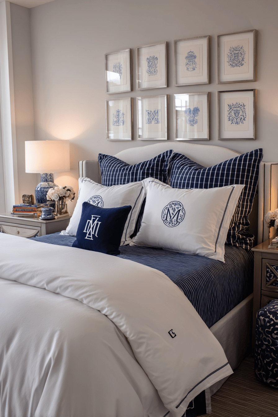 A monogram instantly adds personality and heritage to a preppy bedroom. Whether stitched onto pillows, displayed in artwork, or featured on bedding, it feels custom and refined. This detail works beautifully because personalization is a hallmark of preppy bedroom design. Pair it with structured furniture and classic patterns for cohesion. Keep the color scheme crisp to let the monogram stand out. Click to add that signature preppy touch to your room.