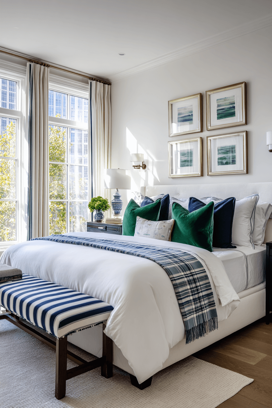A modern preppy bedroom chic style blends classic tailoring with fresh, updated details that feel current and polished. Think crisp white bedding layered with bold accent pillows, sleek nightstands, and subtle pops of navy or emerald. This version of a preppy bedroom works so well because it honors tradition while embracing clean lines and uncluttered styling. Add brass lamps or framed art with structured borders to elevate the look even more. The key is balance—structured patterns paired with airy space so it never feels stuffy. Click to explore how to make preppy feel effortlessly modern.