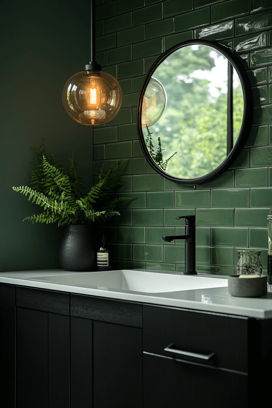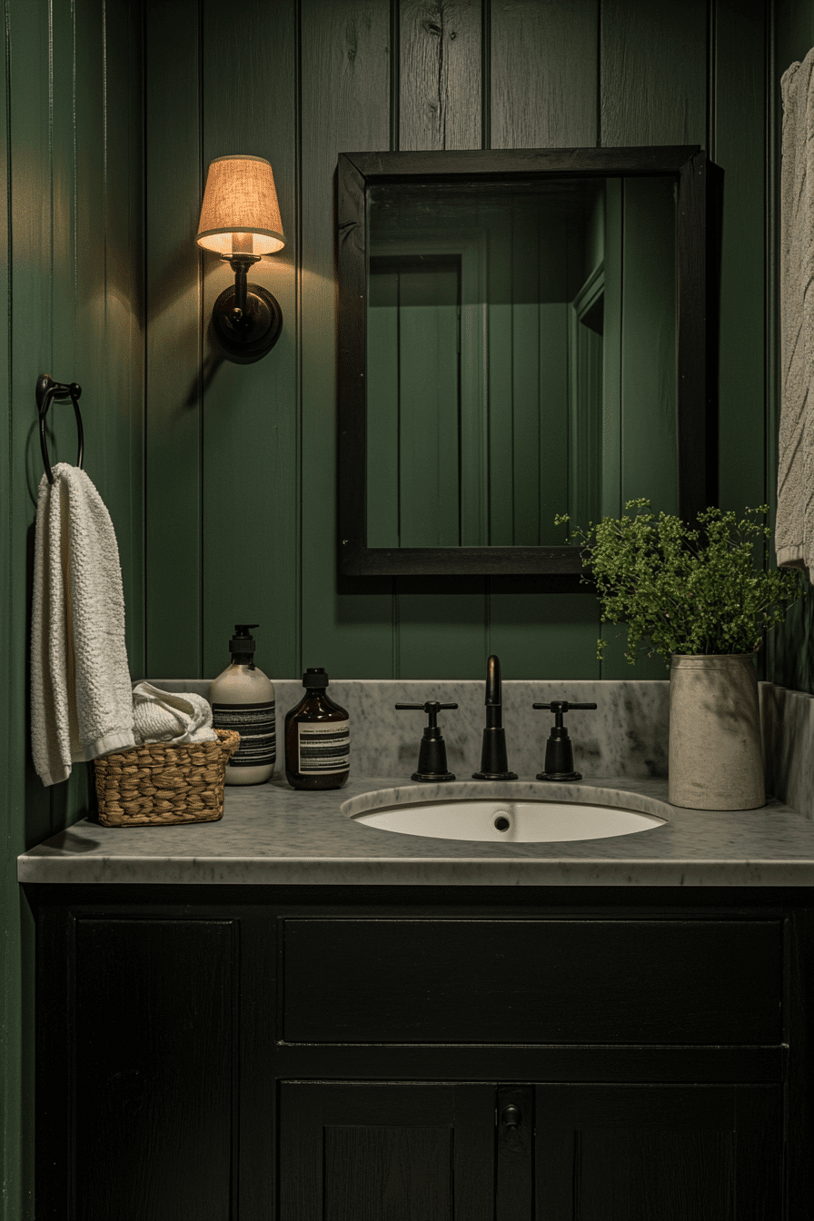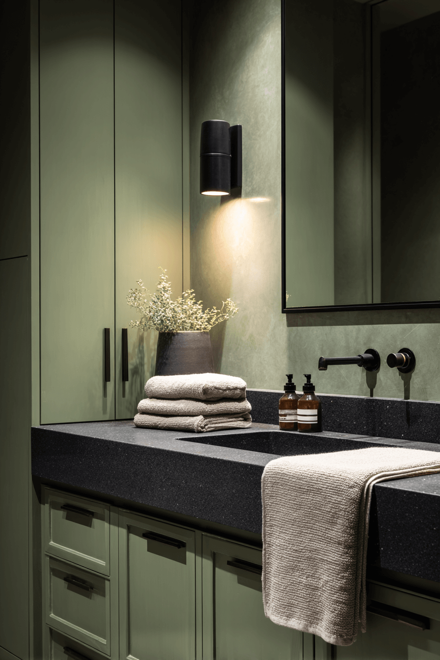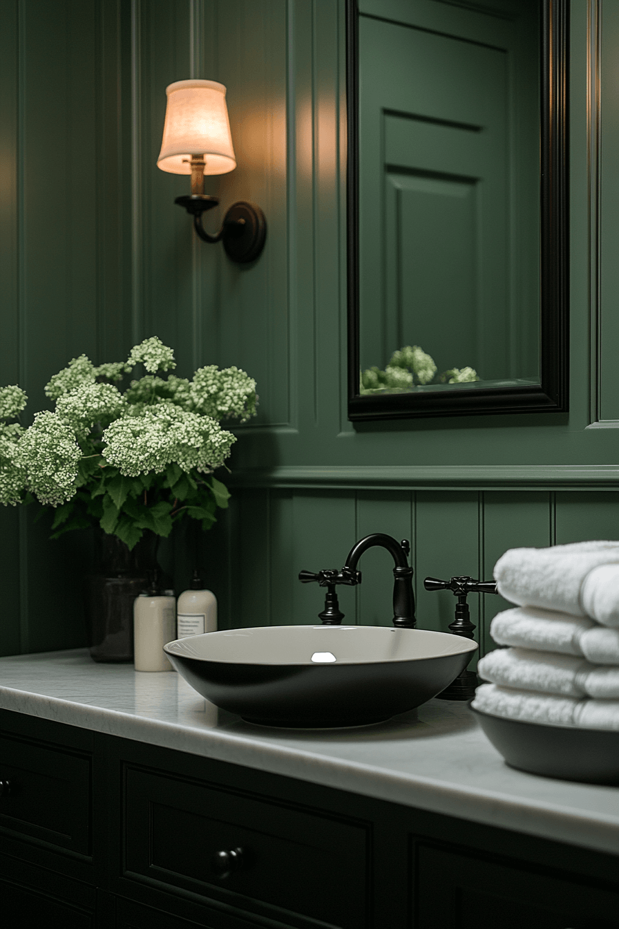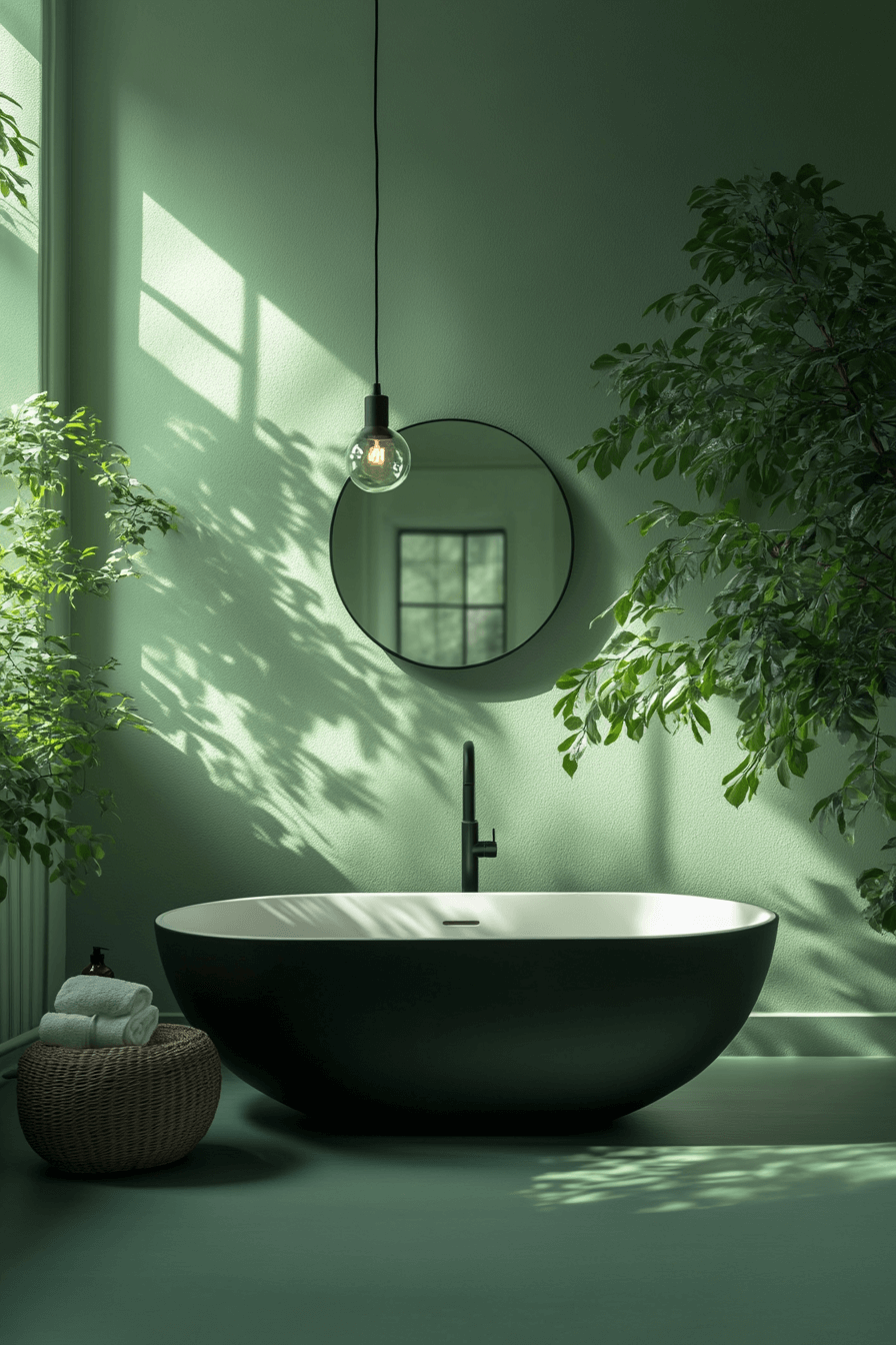 A deeper sage tone paired with rich black elements creates a sage green and black bathroom that feels like a cozy sanctuary. The darker hues wrap the space in warmth without making it feel cramped. Black fixtures add definition and sophistication, giving the room a grounded, modern character. Layered lighting keeps the atmosphere inviting and highlights the texture of tile or cabinetry. The overall effect is a sage green and black bathroom that feels intimate, stylish, and relaxing. Tap to design your own sanctuary-inspired space.