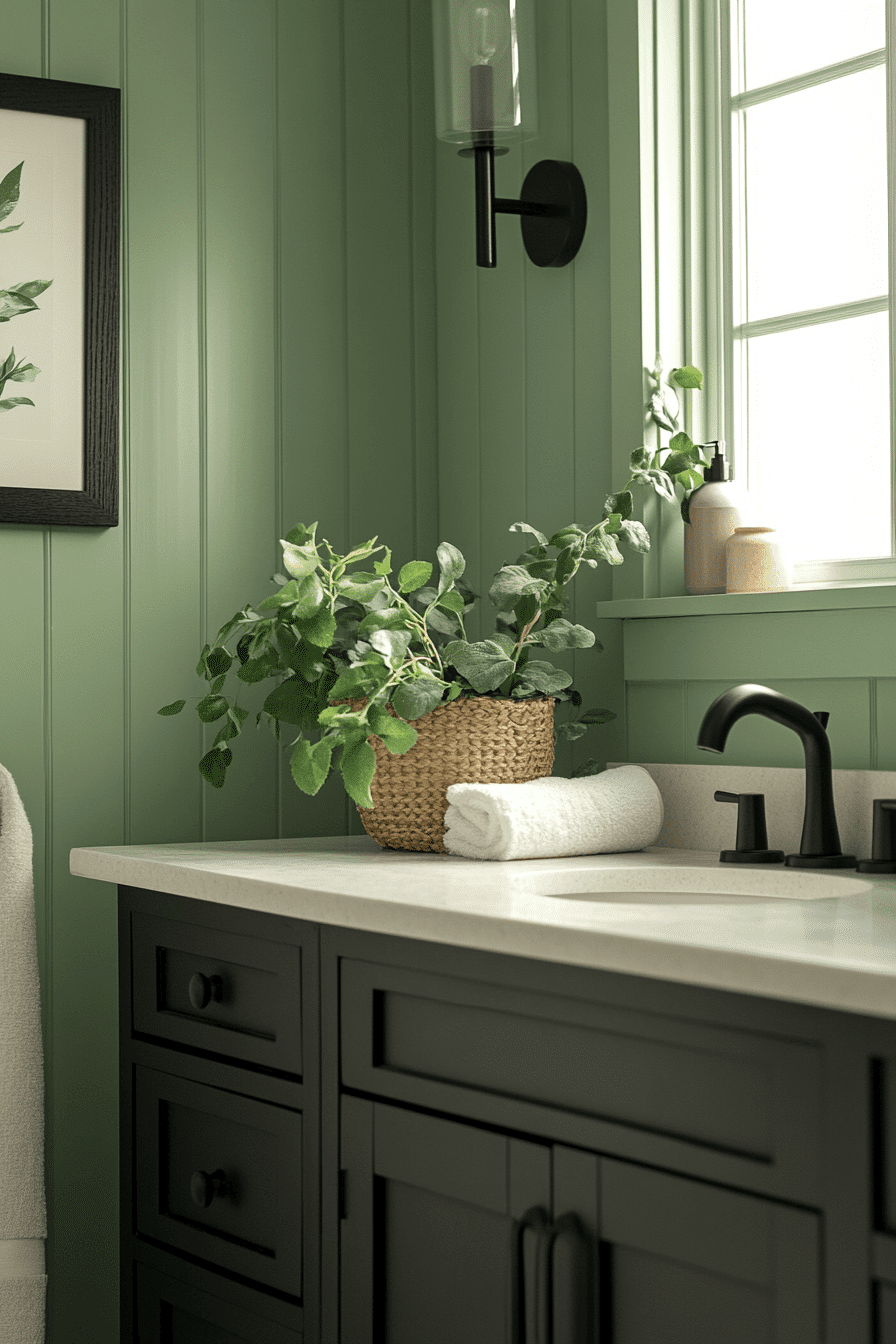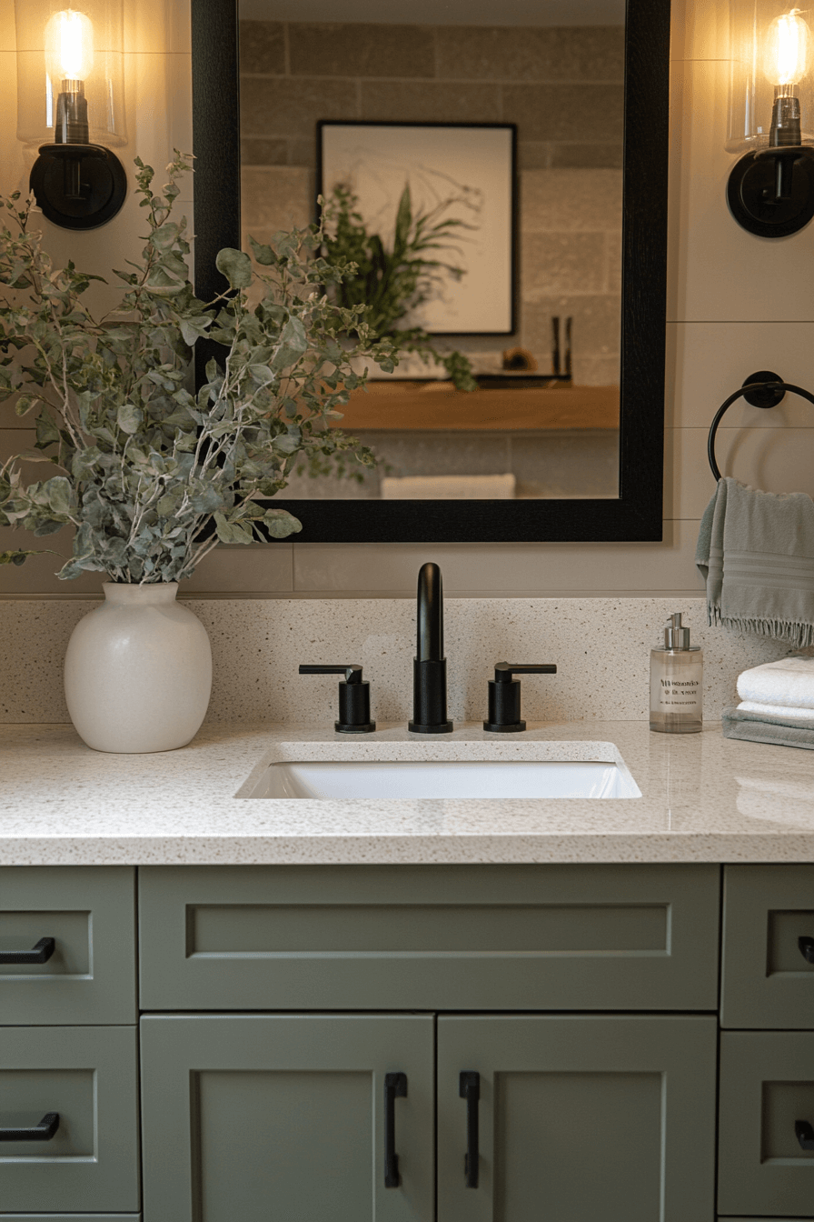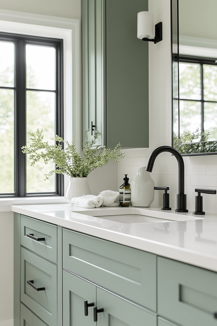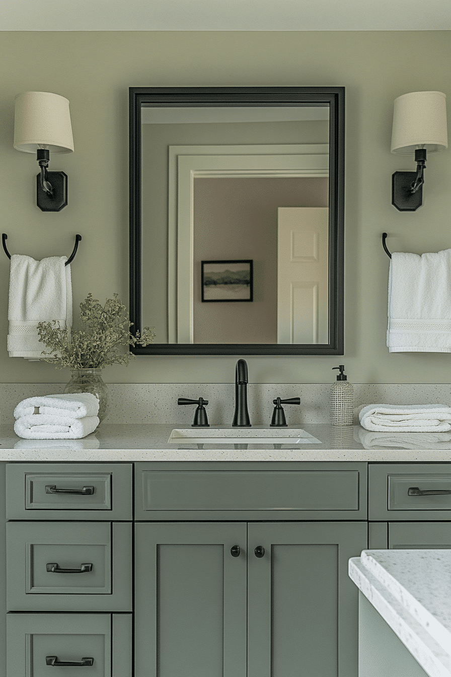 An elevated suite-style sage green and black bathroom feels both luxurious and inviting. Sage cabinetry paired with bold black mirrors and lighting creates visual drama without sacrificing warmth. The combination works because sage softens the sharpness of black, resulting in a harmonious flow. Marble or stone accents add sophistication and brightness. The entire sage green and black bathroom feels high-end, cohesive, and beautifully styled. Click to elevate your bathroom into a suite-worthy space.