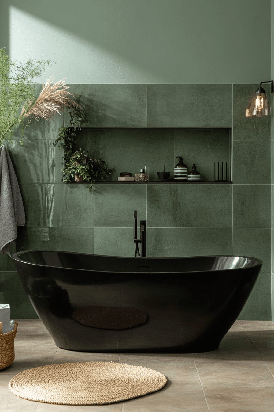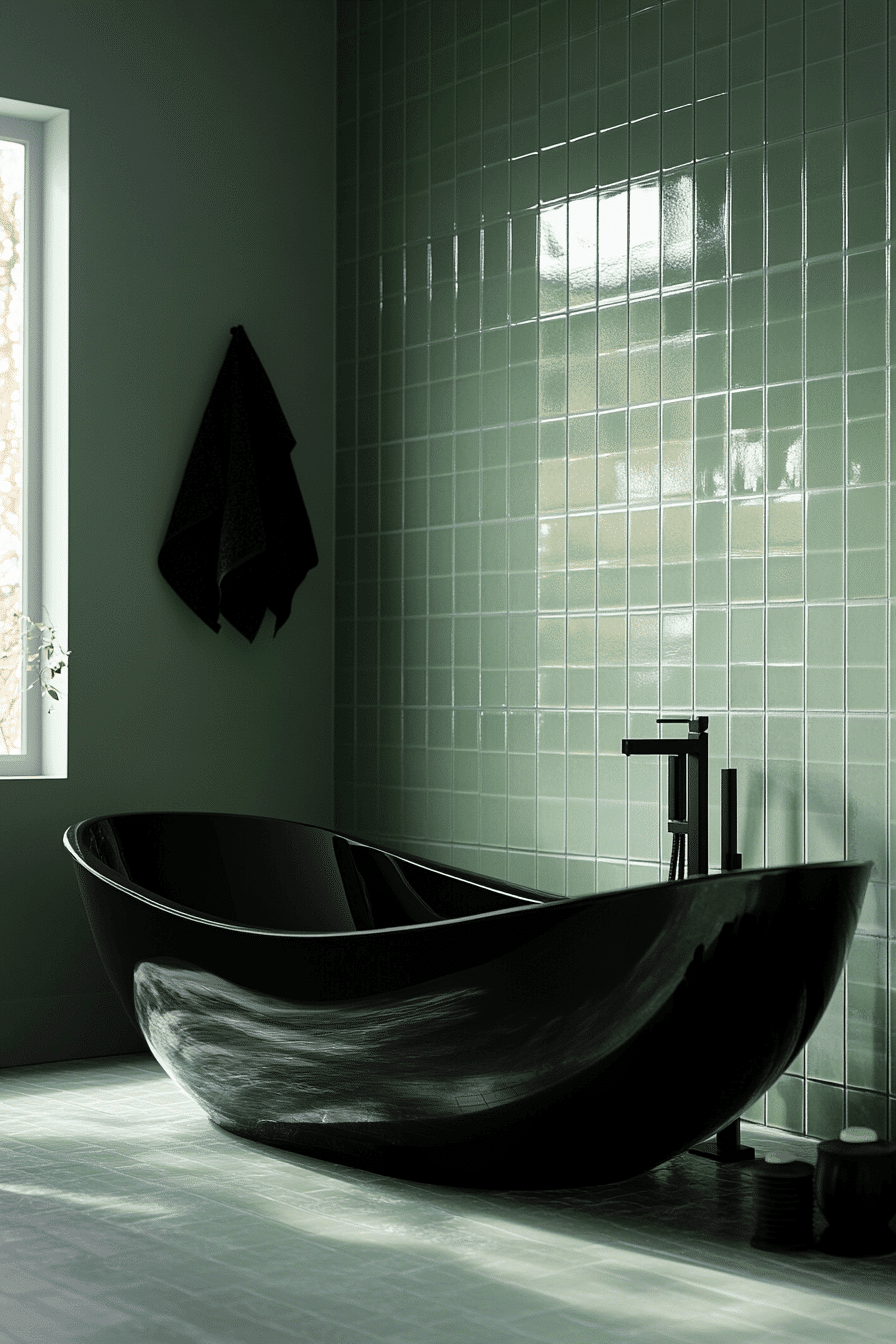 If you love dramatic spaces, a sage green and black bathroom with a noir twist is pure magic. Darker sage tones set a moody backdrop, while glossy black tile or trim adds striking contrast. The beauty of this combination is that sage prevents the black from feeling harsh, keeping the overall mood balanced and inviting. Soft lighting and reflective surfaces enhance the depth, making the space feel layered and intentional. Altogether, the sage green and black bathroom becomes bold yet beautifully cohesive. Tap to explore this dramatic design direction.