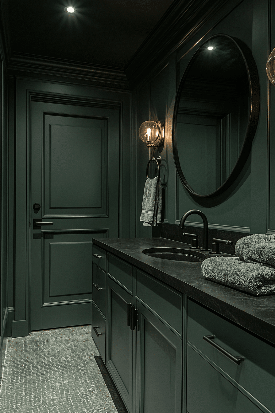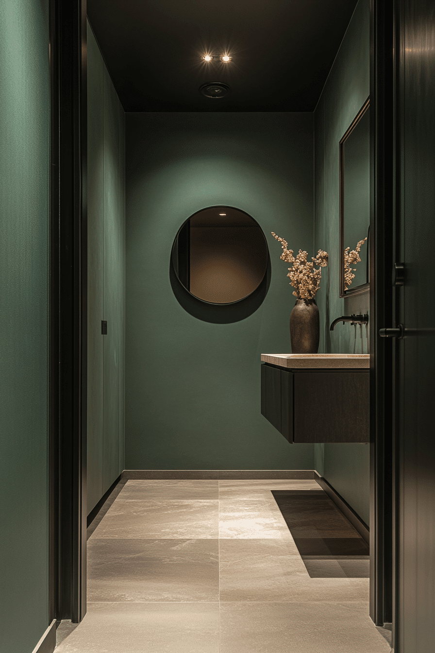Even a small space can make a big impression with a sage green and black bathroom concept. A sage accent wall behind a floating black vanity creates instant contrast and depth. The reason this works so well in a powder room is that the darker black details define the space, while sage keeps it airy and stylish. Add a round mirror and subtle lighting for a contemporary touch. This sage green and black bathroom proves that compact spaces can still feel bold and elevated. Click to transform your powder room with this sleek style.
