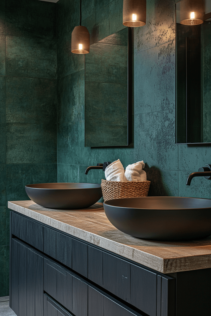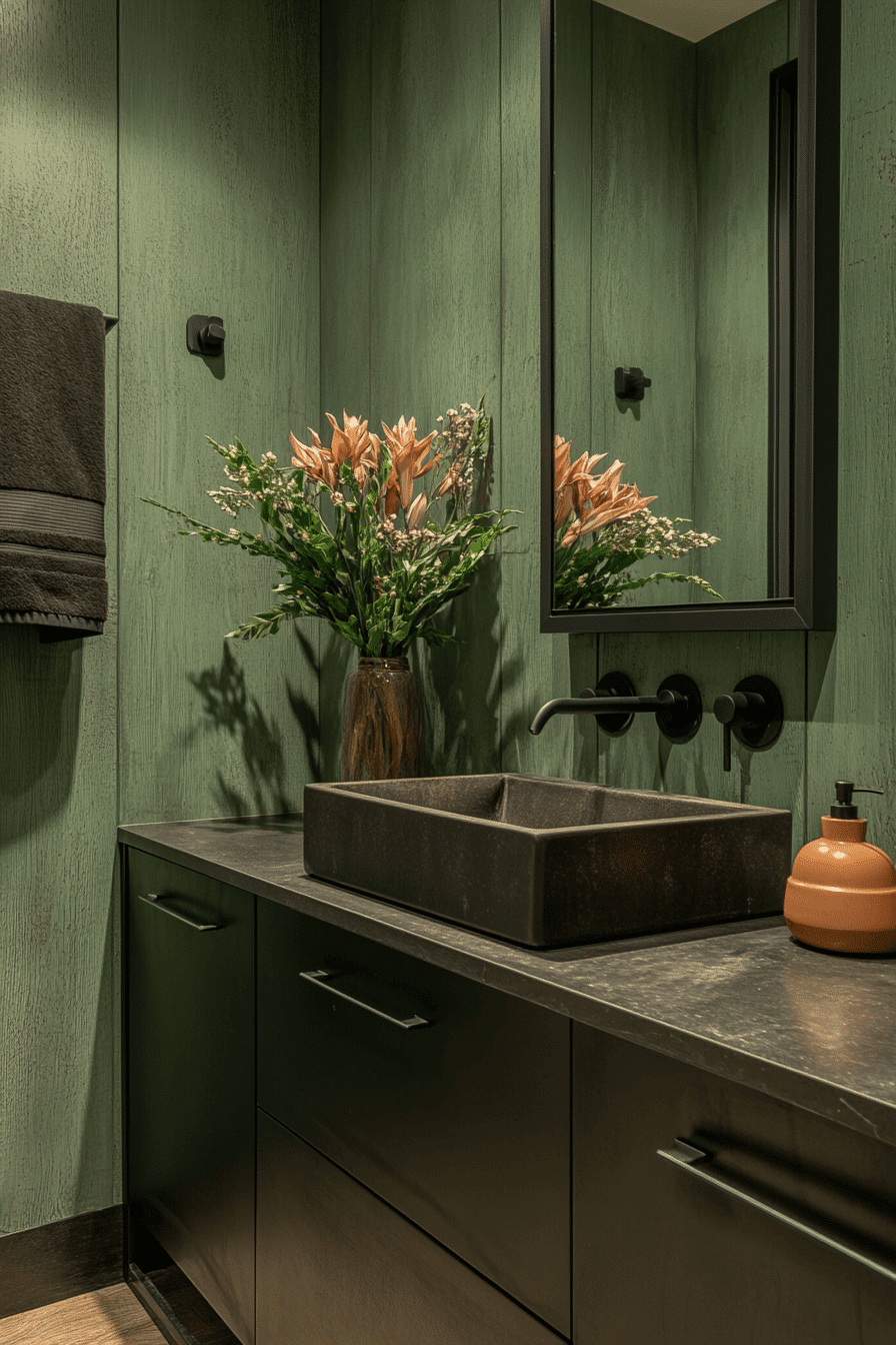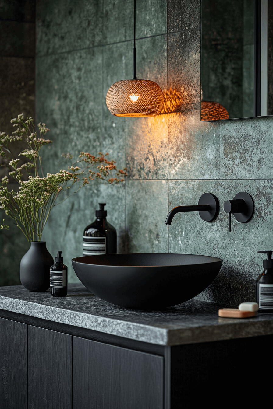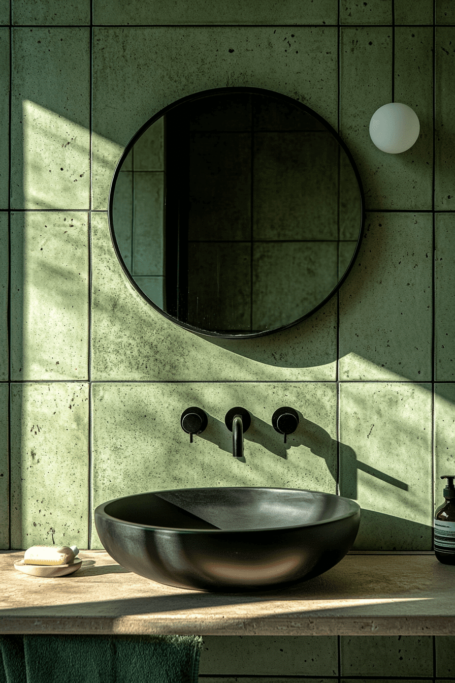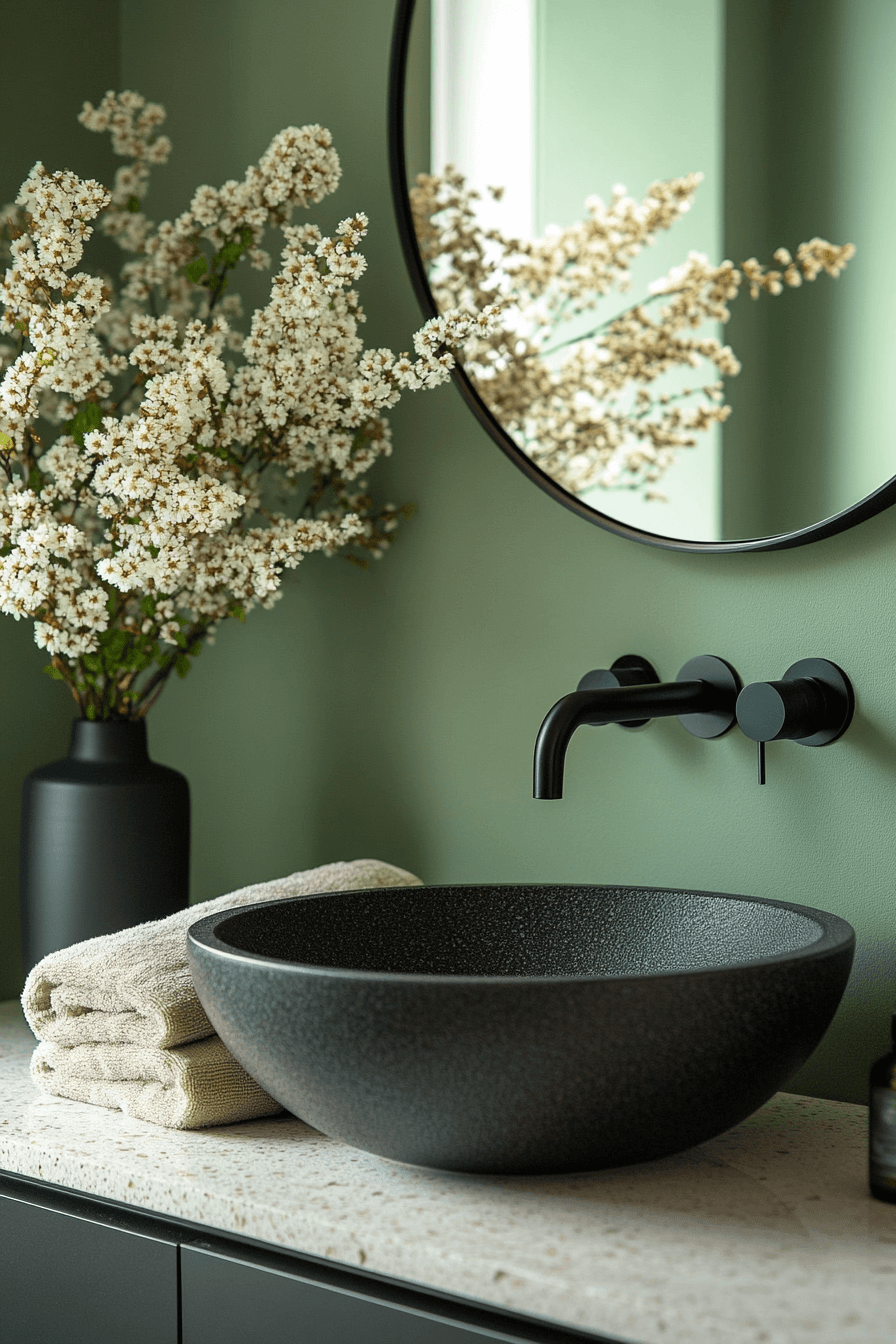 Textural contrast elevates a sage green and black bathroom into something truly special. Imagine sage velvet accents or cabinetry against bold black stone countertops or tile. The softness of sage balances the strength of black stone, creating a luxurious harmony. This pairing works because texture adds depth beyond just color contrast. The finished sage green and black bathroom feels rich, tactile, and visually captivating. Tap to bring this textured elegance into your home.