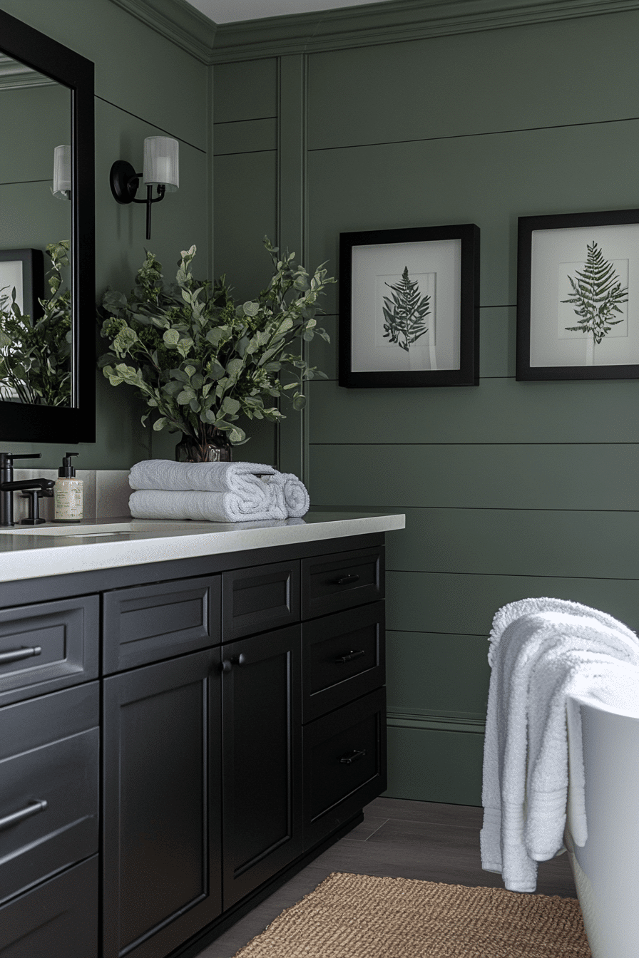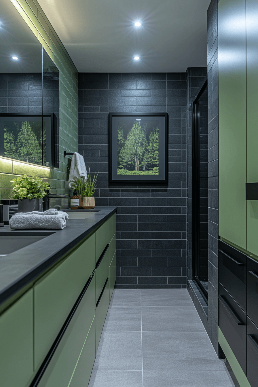 Sage green and black bathroom ideas create bold luxury that transforms your bathroom into a dramatic yet sophisticated retreat. This striking color combination brings earthy calm and modern edge together, delivering a high-contrast space that feels both daring and deeply refined.