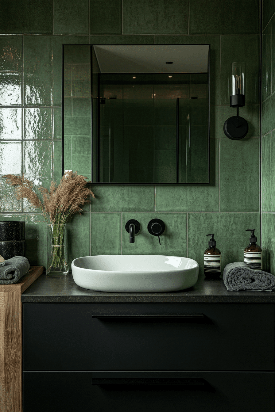 Black tile becomes instantly more approachable when paired with sage in a sage green and black bathroom design. Sage walls or cabinetry soften the intensity of dark tile, creating a balanced and inviting look. This contrast works because the earthy green harmonizes beautifully with deep black tones. Light grout or subtle textures add dimension without distraction. The overall effect is a sage green and black bathroom that feels modern yet grounded. Tap to see how to style this stunning tile pairing.