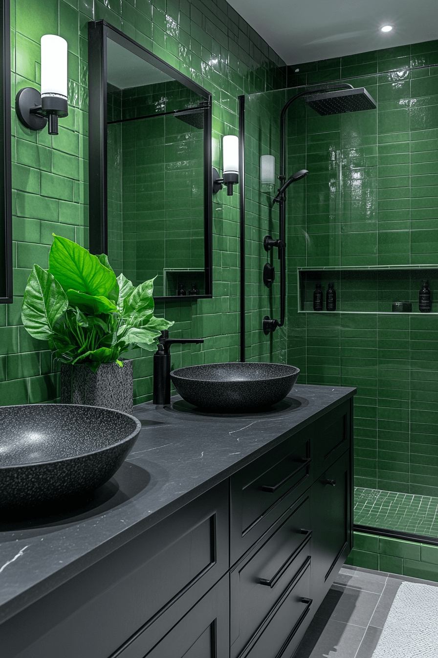 Serenity comes naturally in a sage green and black bathroom that blends softness with strength. Gentle sage hues calm the senses, while black elements provide grounding and visual interest. The combination works because the contrast creates dimension without overwhelming the space. Add warm wood or subtle metallic accents for a layered finish. The end result is a sage green and black bathroom that feels peaceful yet undeniably chic. Tap to create your own serene retreat.