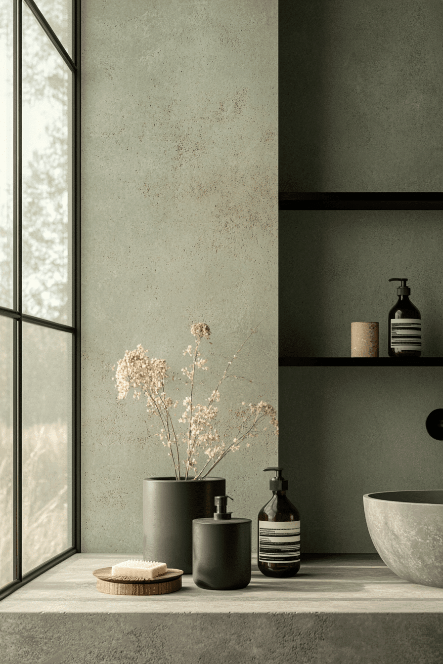 For a city-inspired edge, a sage green and black bathroom can channel urban sophistication. Sleek black metal frames, minimalist shelving, and muted sage walls create a refined industrial vibe without feeling cold. The pairing works because sage introduces softness that balances the sharpness of black details. Concrete or stone textures enhance the contemporary feel while maintaining warmth. Together, the sage green and black bathroom feels edgy yet approachable. Click to explore this urban noir aesthetic.