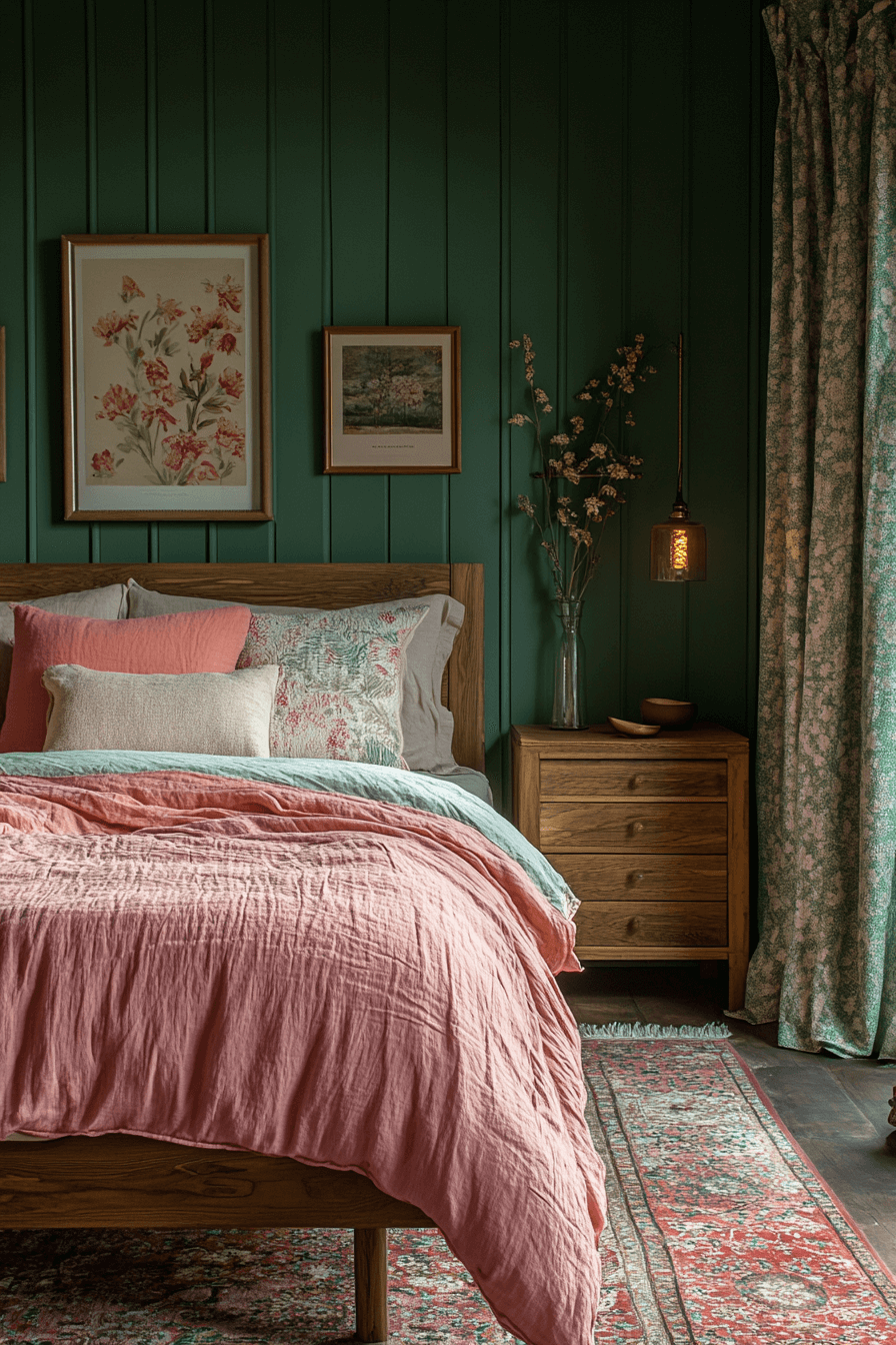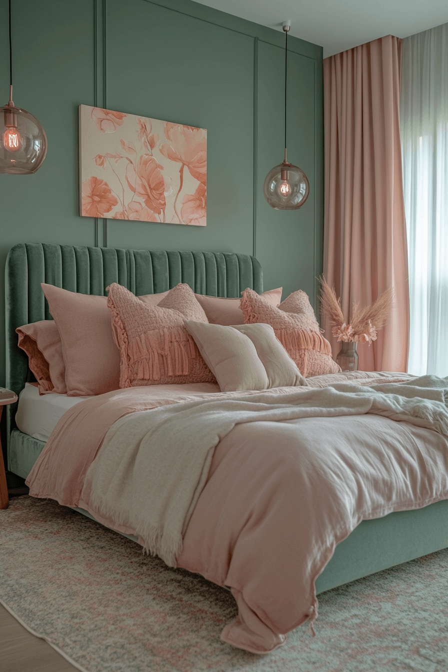 A sage green and pink bedroom gains a refined edge when dusty pink is involved. Pair muted sage walls with dusty rose throws and curtains. Use sharp-lined furniture to keep things grounded. It’s the perfect blend of muted and modern. This combo offers depth without drama. Tap to try this fresh take on pink and green!