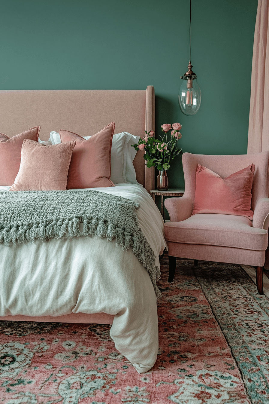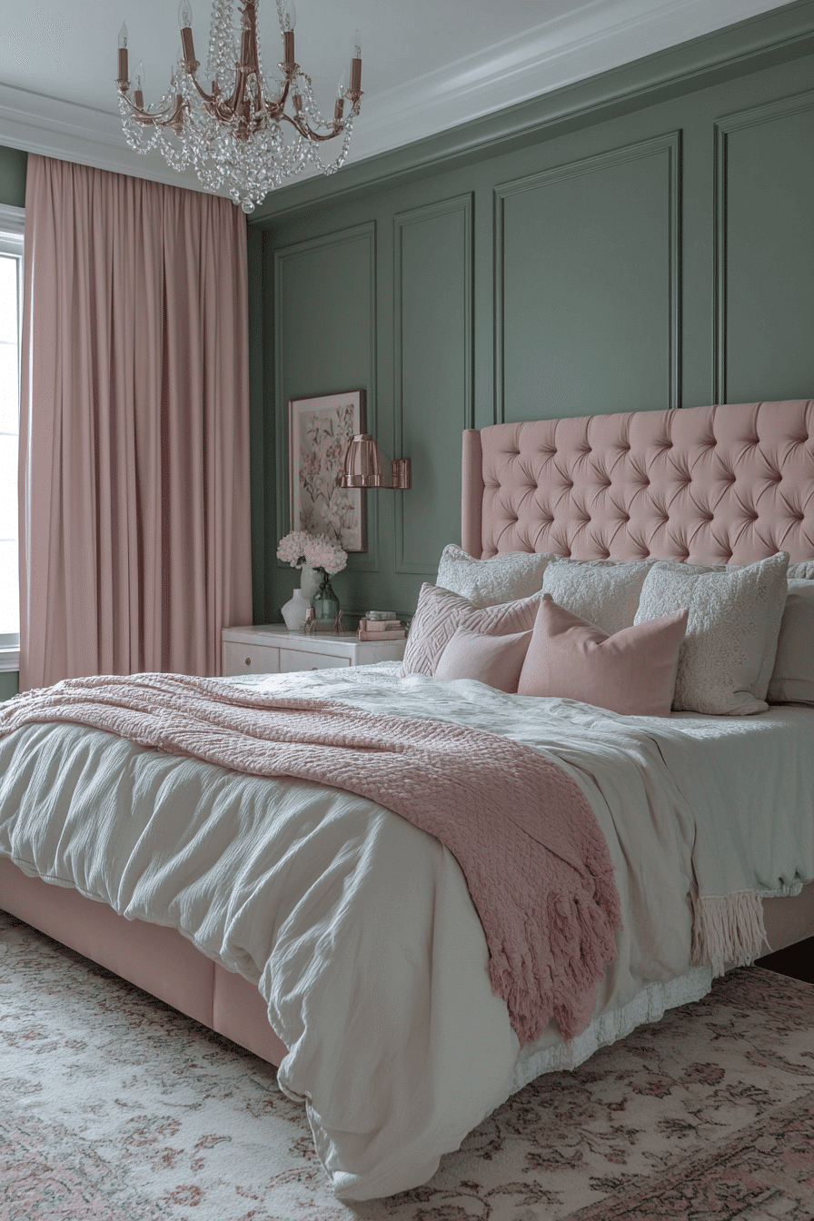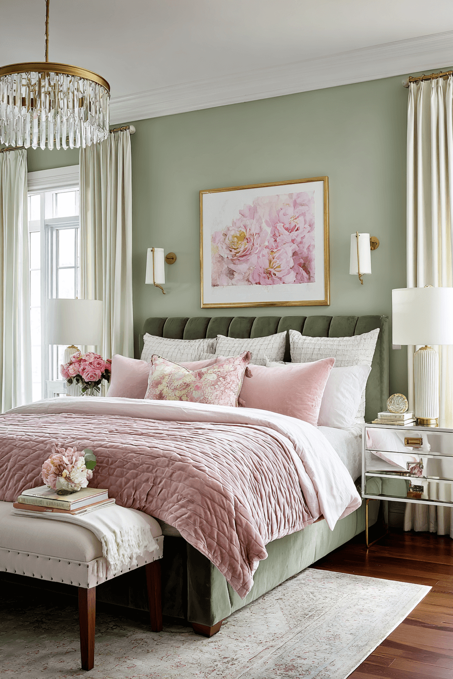 Rosé pink tones bring elegance and femininity to a sage green and pink bedroom. Combine a sage backdrop with soft rosé textiles and gold finishes. Keep patterns subtle or avoid them entirely for a clean look. Let materials like velvet and silk add sophistication. The palette is classy, grown-up, and glow-worthy. Click to elevate your room with rosy elegance!