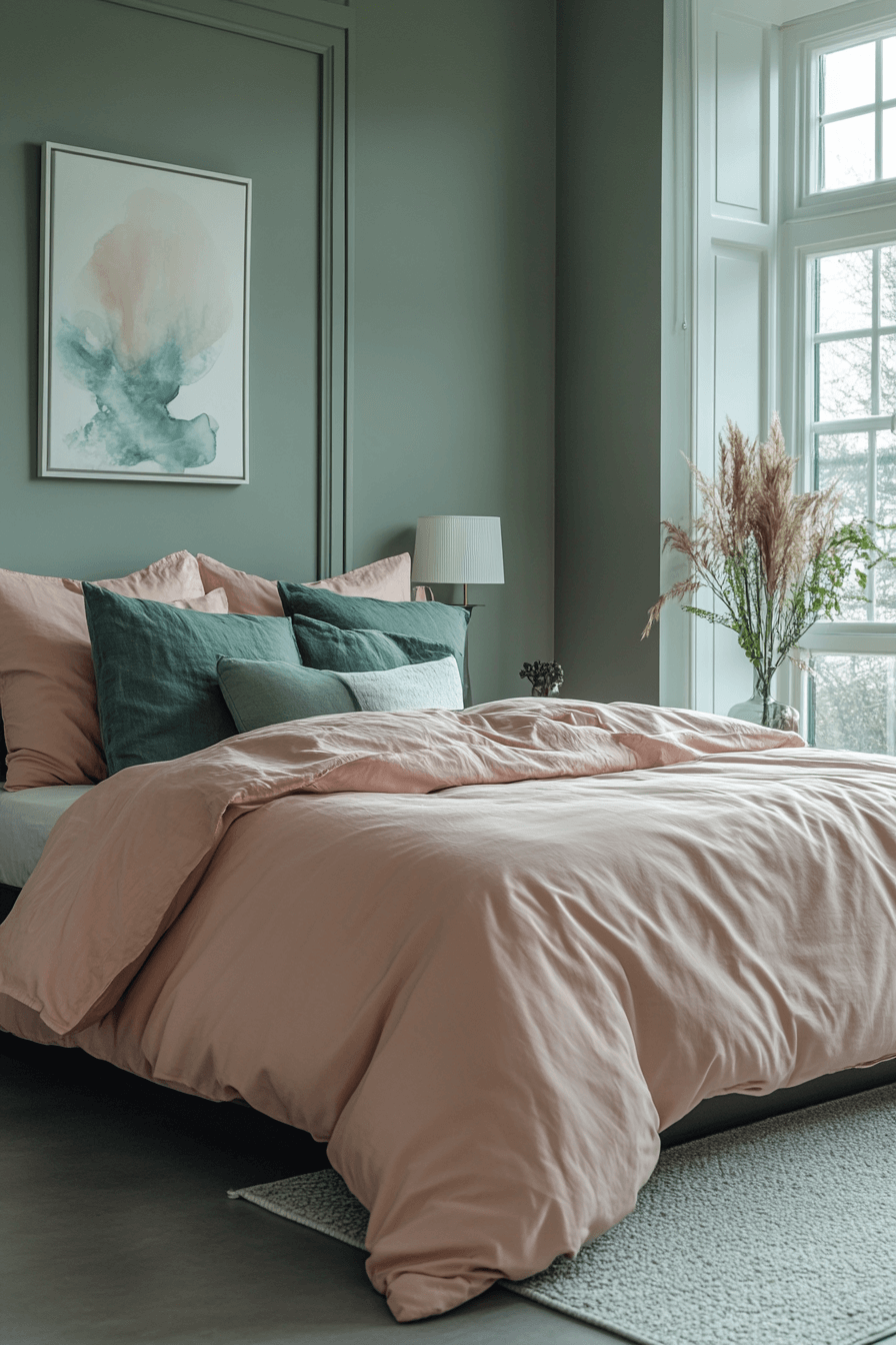 A sage green and pink bedroom looks chic with a minimalist layout. Use pale sage walls, blush bedding, and clean-lined furniture. Skip the extra throw pillows and knick-knacks. Focus on symmetry and negative space to amplify the minimalist appeal. The palette provides warmth without visual clutter. Tap to discover this simplified beauty!