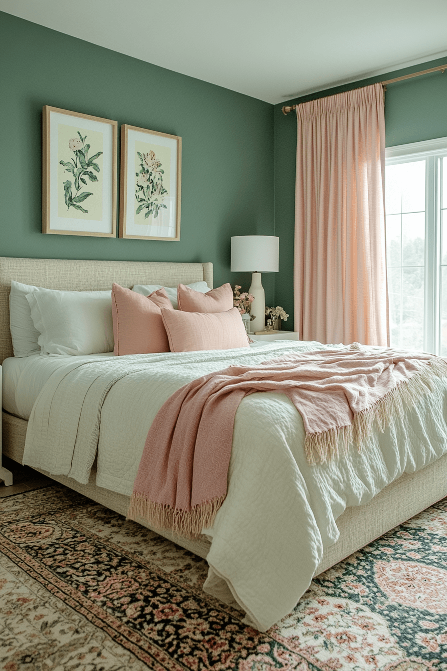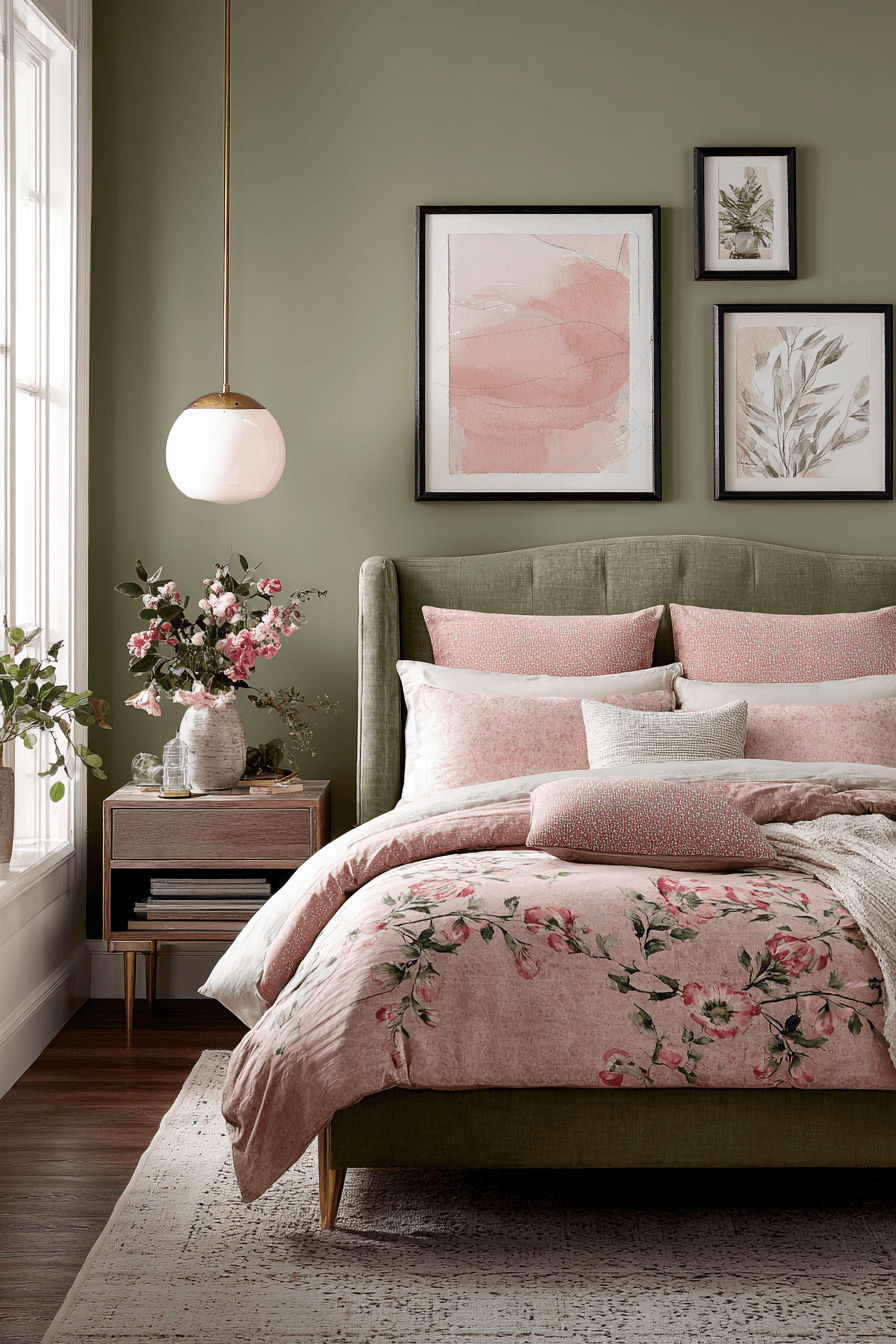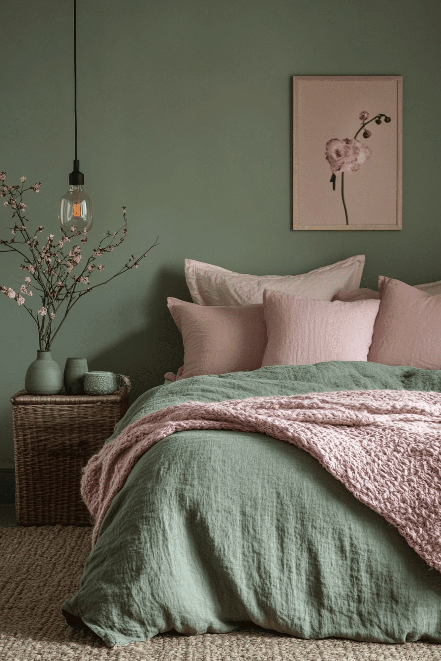 A warm sage green and pink bedroom creates a cozy, inviting aesthetic perfect for any season. Use warm-toned pinks like coral or terracotta to complement deeper sage greens. Soft lighting enhances the cozy vibe. Stick with warm neutrals in the furniture and flooring to anchor the space. This look feels modern with a touch of charm. Click to see warmth meet calm!