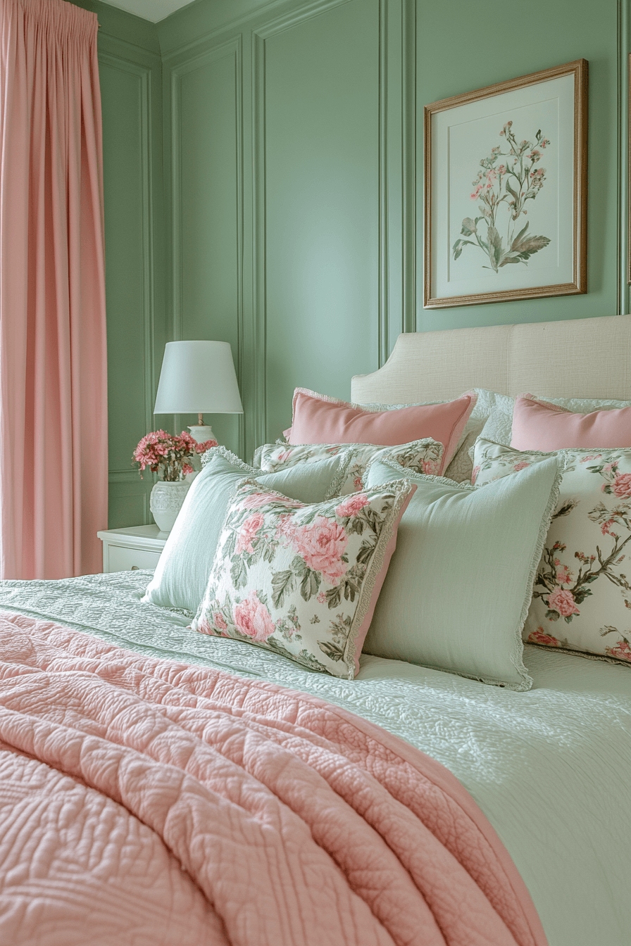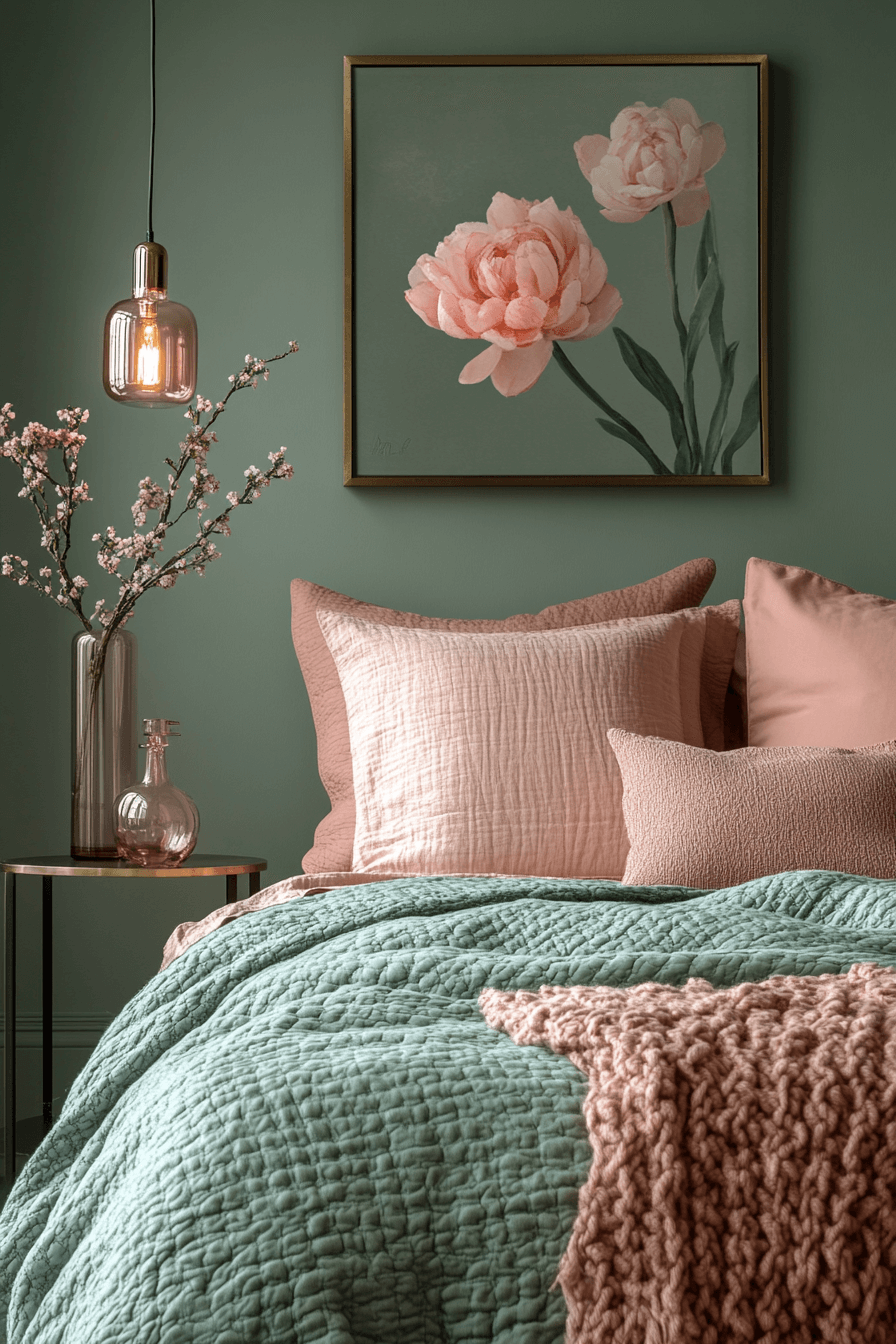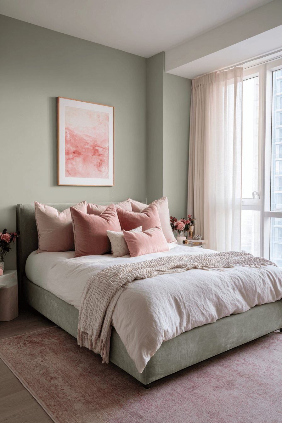 Layering is key to a cozy, chic sage green and pink bedroom. Start with sage on the walls, then bring in layers of pink through bedding, cushions, and curtains. Vary textures to keep it interesting—think velvet, linen, or brushed cotton. Balance it all with neutral accents. The space feels both curated and comforting. Click to try layered softness!