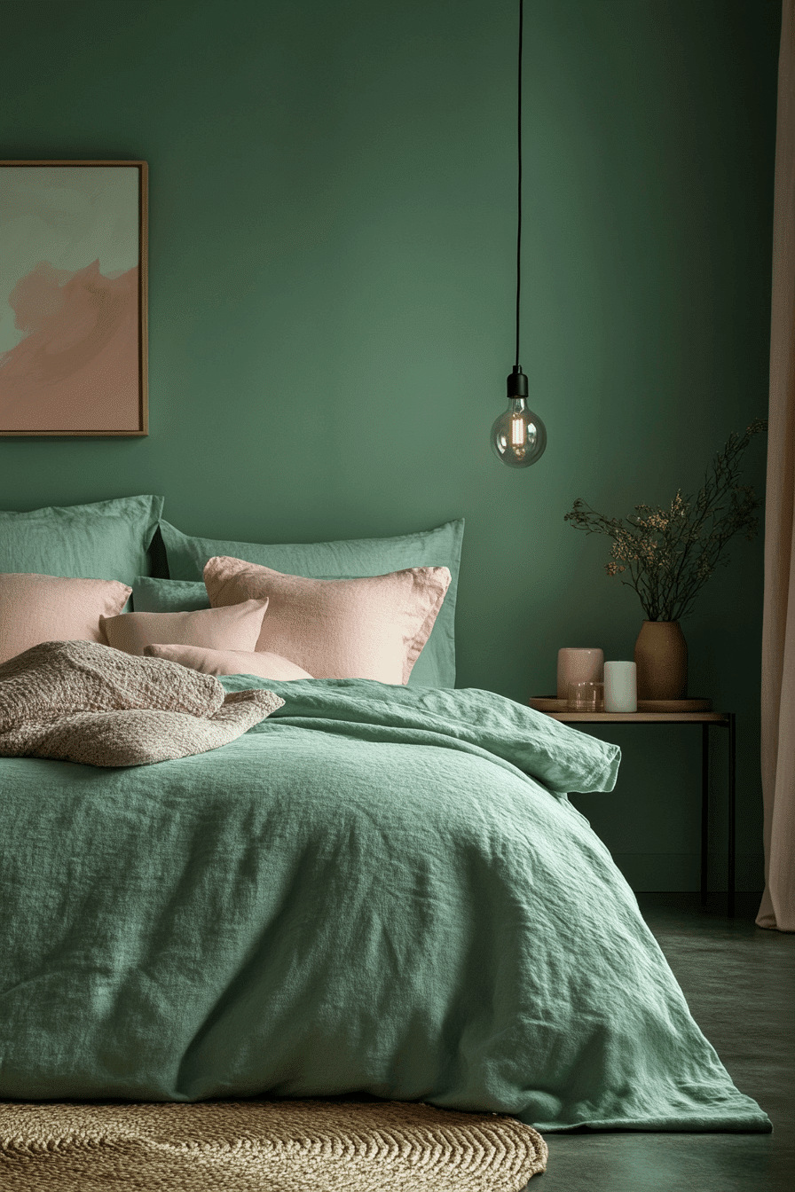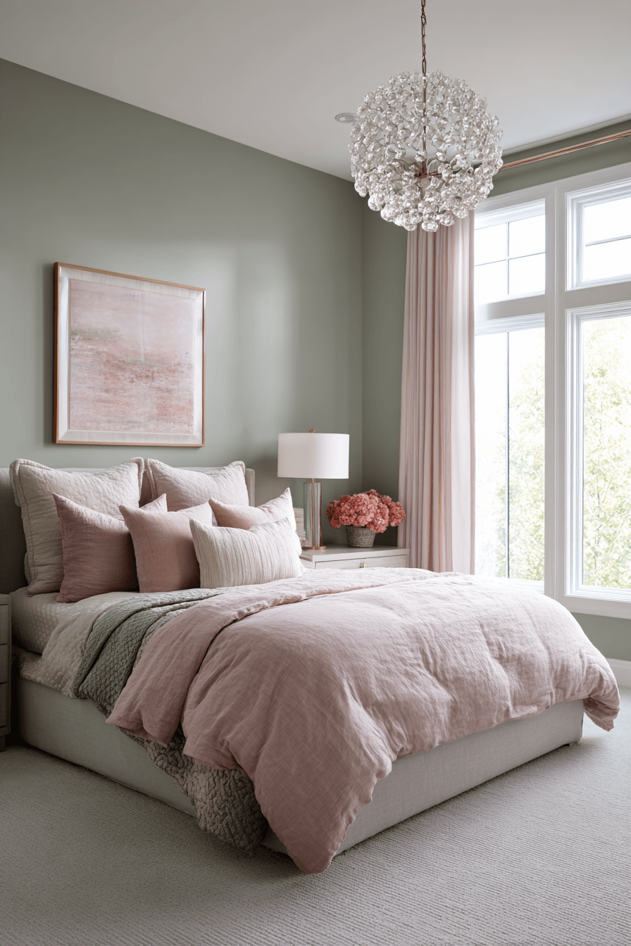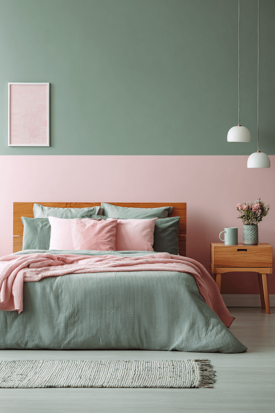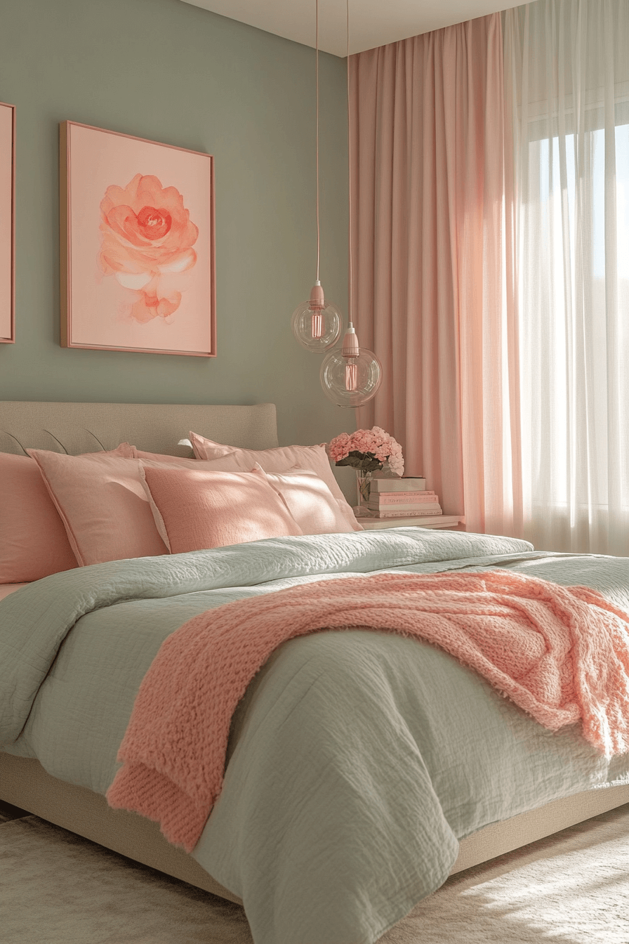 Combine the optimism of pink with the grounding power of sage in a sage green and pink bedroom. Let one hue lead—such as a sage base—while the other accentuates. The result is a playful yet polished environment. Modern lighting and minimal furniture keep the focus on the palette. This space feels intentional and mood-lifting. Click to experience this color harmony!