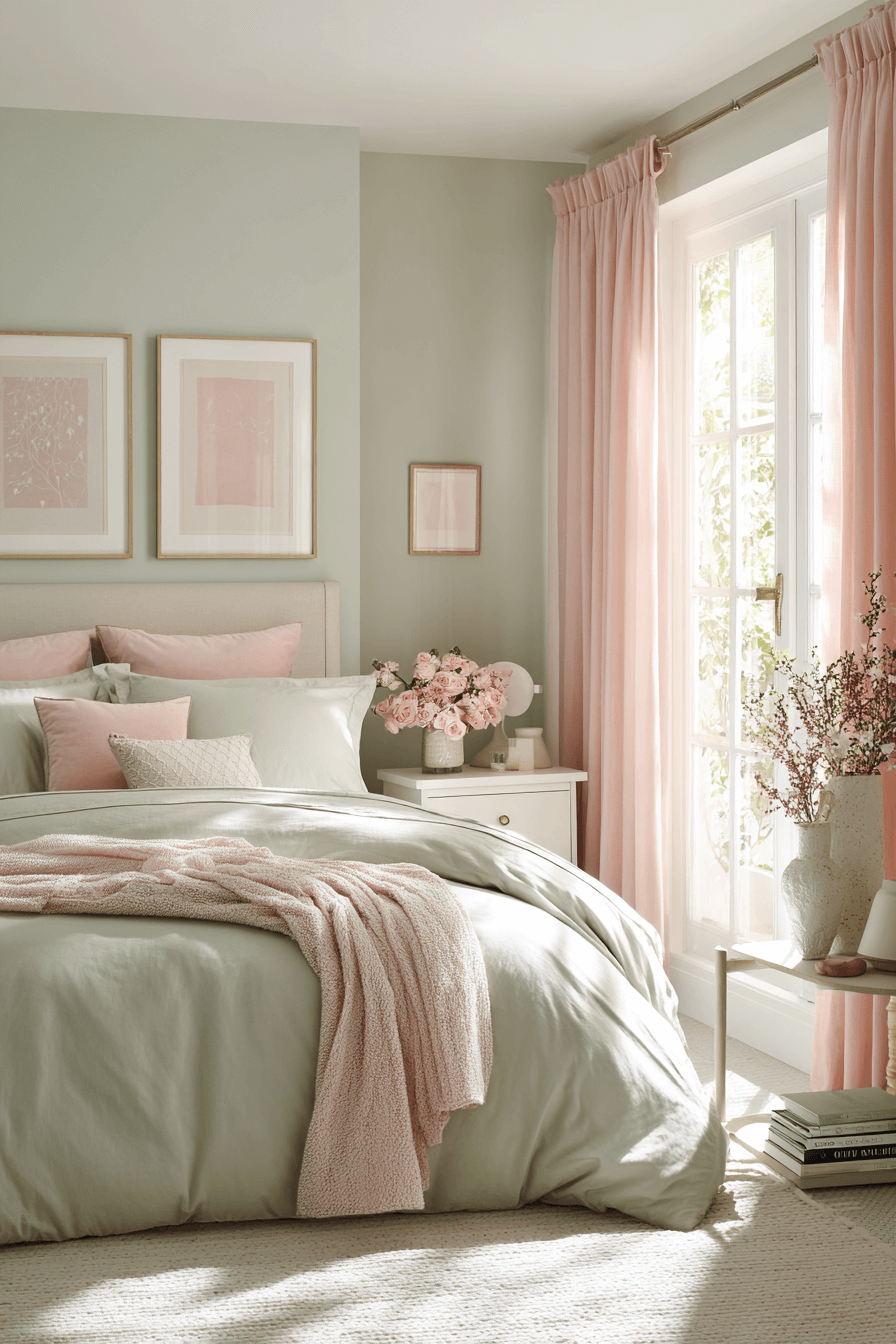 A sage green and pink bedroom makes the perfect retreat when styled with sleek, modern finishes. Blush curtains paired with sage-toned bedding bring color without clutter. Add gold or brass accents for a polished look. The result is a space that feels both fresh and fashion-forward. Soft lighting completes the retreat-like atmosphere. Tap to create your own rosy escape!
