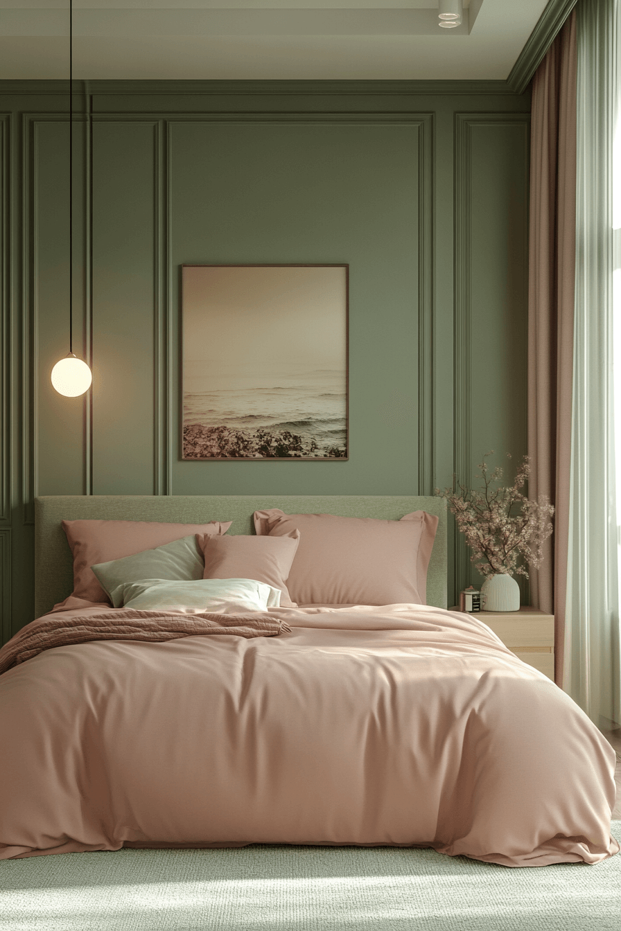 Nude blush tones paired with sage green create a modern chic vibe that feels current and cozy. In a sage green and pink bedroom, use these colors in layers—walls, pillows, rugs, and curtains. Add modern lighting and a neutral area rug for a grounded aesthetic. The palette is subtle but deeply stylish. Everything feels smooth and refined. Click to explore modern chic layers!