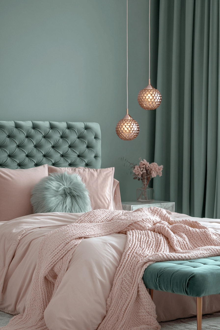 Luxe touches like velvet fabrics and metallic accents elevate a sage green and pink bedroom. Sage walls act as a rich, grounding backdrop for blush pink bedding and textured decor. Layer different finishes to add depth and luxury. The palette remains soft yet sophisticated. This combo works beautifully in upscale modern interiors. Click to indulge in stylish luxury!