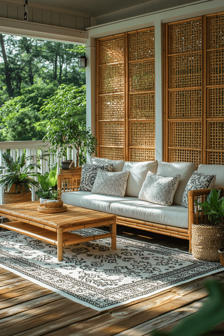 This porch reimagines outdoor relaxation through the lens of a Scandinavian Japanese interior, featuring elegant shoji screens and light wooden textures. Softly filtered sunlight creates a dreamy, balanced environment for rest or reflection. Simple furniture keeps the look grounded in functionality and grace. The connection to nature feels organic and soothing.