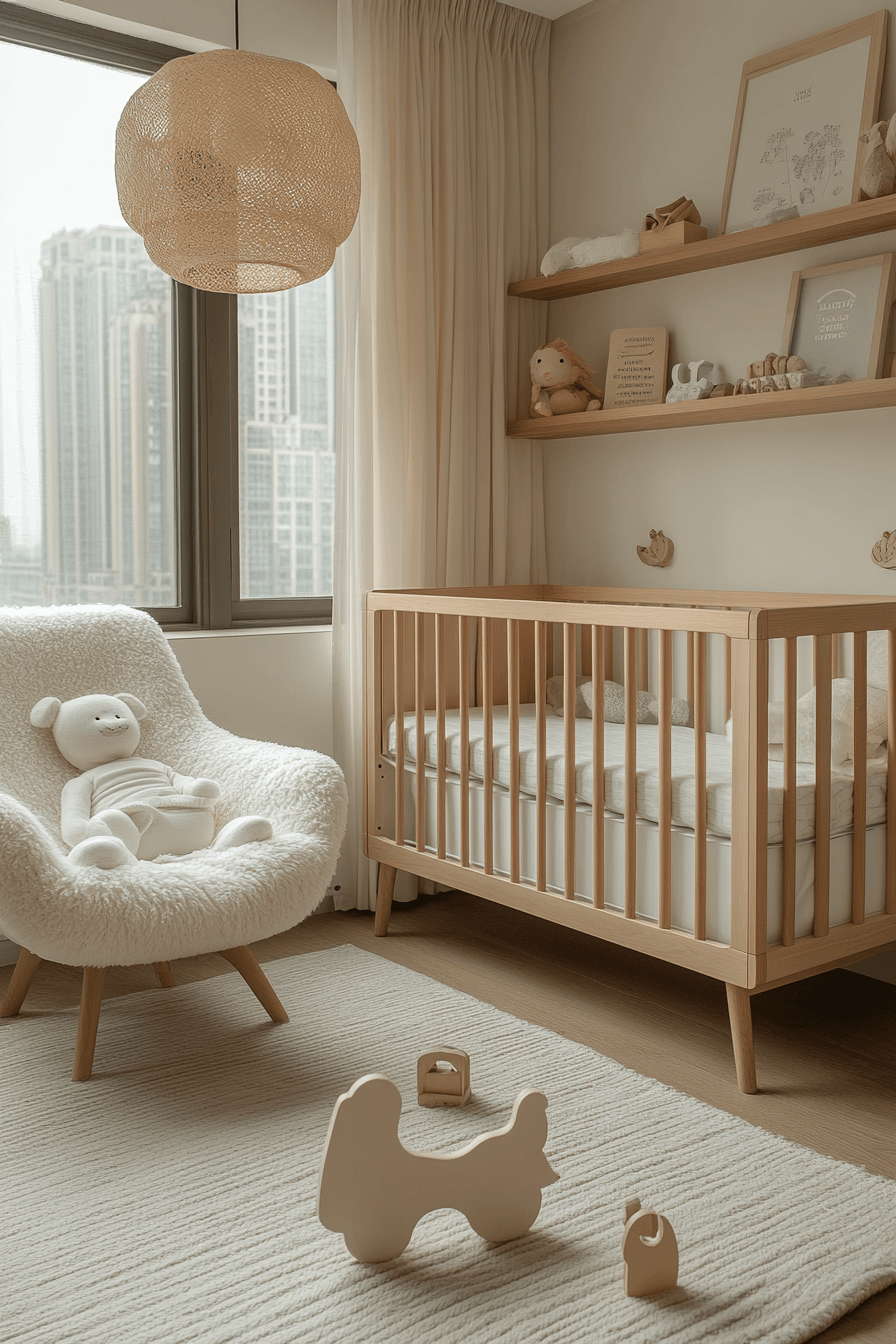 The nursery inspired by Scandinavian Japanese interior principles creates a soothing space for both baby and parent. Gentle hues, soft fabrics, and low furniture cultivate safety and serenity. Natural wood and cotton textures encourage a connection to nature from the very start. Hidden storage keeps essentials tidy while maintaining a minimalist charm.