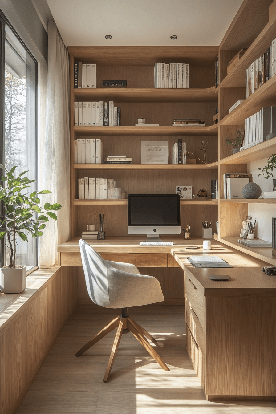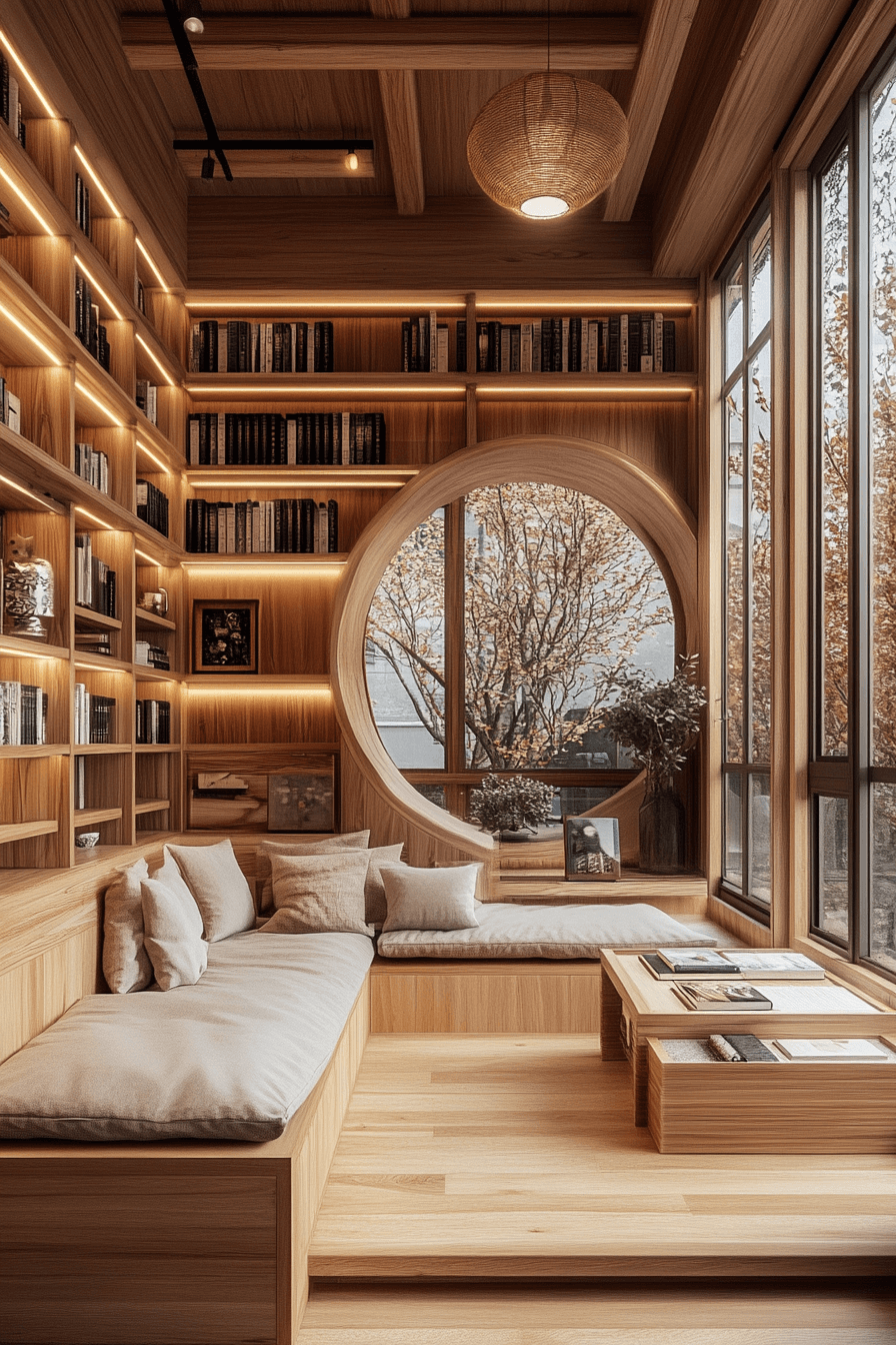 This library redefines cozy minimalism through a Scandinavian Japanese interior lens. Light wood shelving, soft fabrics, and natural illumination make it a haven for readers. The space feels open yet intimate, encouraging peaceful reflection and focus. Subtle textures and neutral tones add depth without distraction.