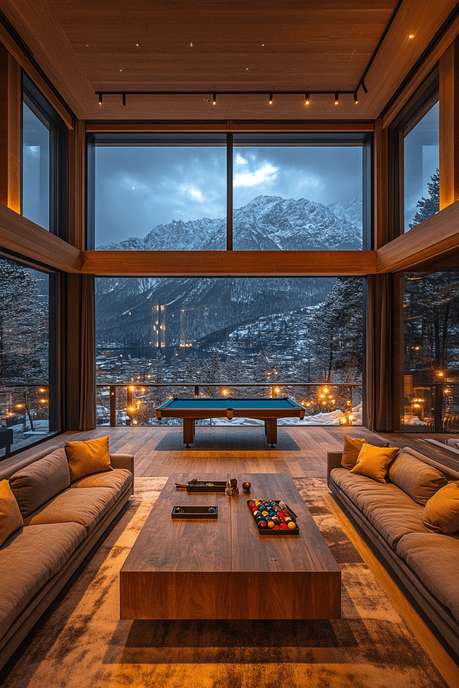 This game room channels the essence of play and calm through a Scandinavian Japanese interior aesthetic. Natural wood finishes, comfortable seating, and subtle lighting create a refined yet lively atmosphere. Technology and design flow together seamlessly for a modern, clutter-free space. Earth-inspired hues balance energy and tranquility.