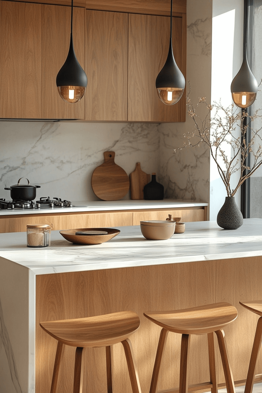 This Scandinavian Japanese interior kitchen radiates warmth through a blend of clean lines and organic textures. Natural light wood and stone surfaces create an airy, grounded atmosphere that feels calm yet sophisticated. Minimalist shelving and sleek appliances keep the layout efficient and clutter-free. Every detail reflects the harmony of Scandinavian functionality and Japanese elegance.