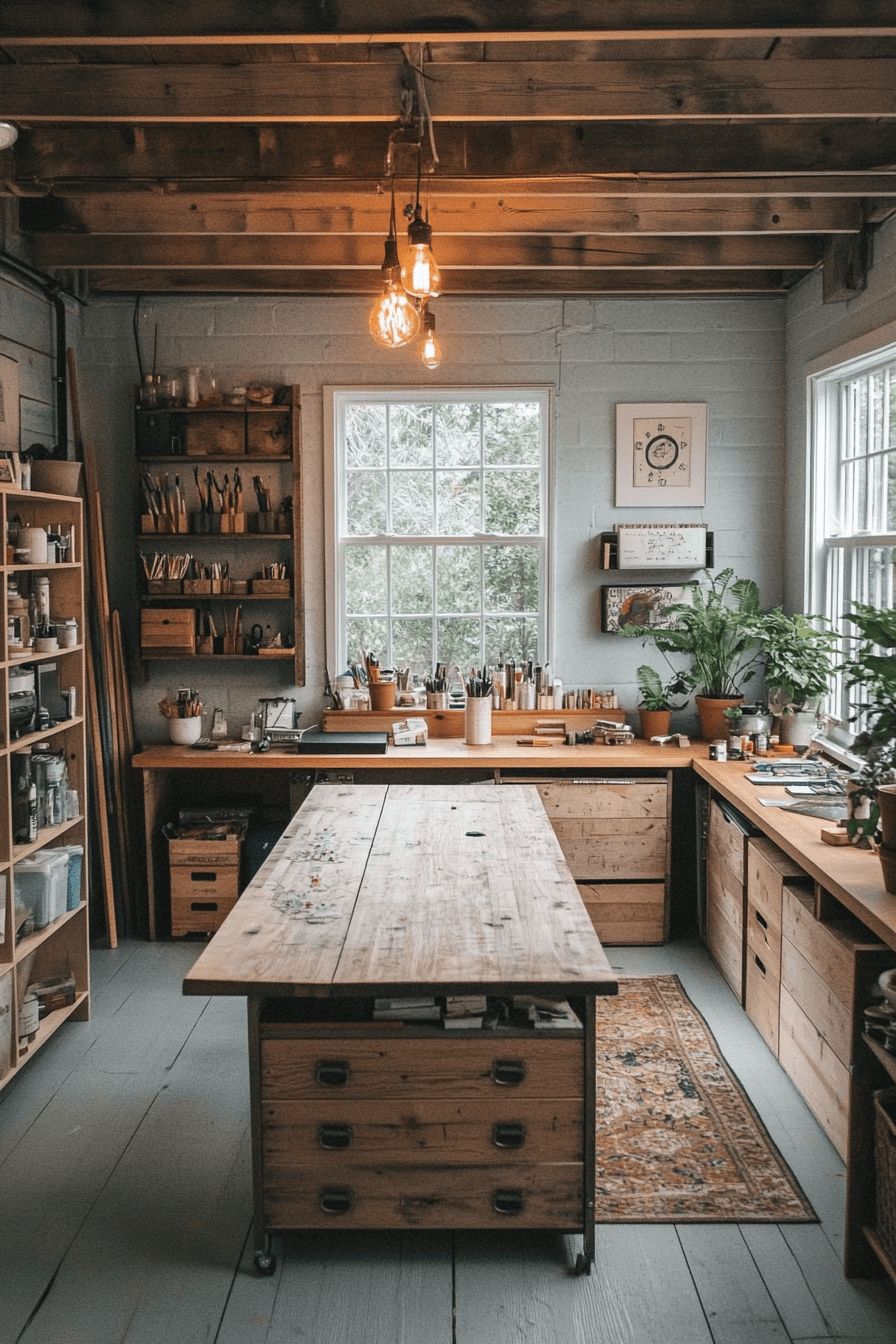 The workshop space thrives on creativity and structure through a Scandinavian Japanese interior approach. Sleek workbenches, natural materials, and bright lighting energize the mind while maintaining clarity. Every element is thoughtfully designed for purpose, ensuring both aesthetics and efficiency. The overall vibe feels balanced, calm, and inspiring.