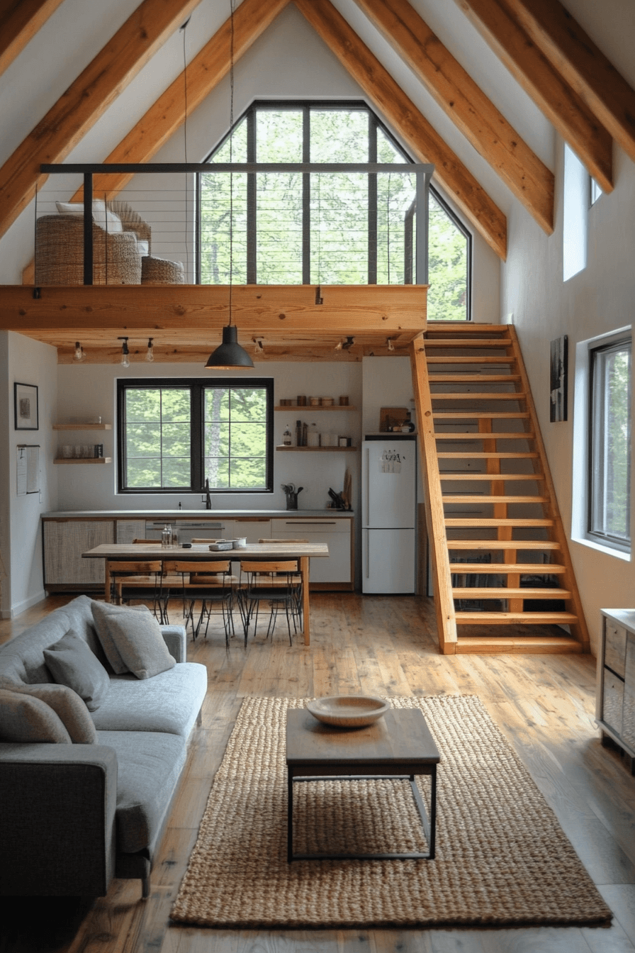 This loft embodies the warmth and openness of a Scandinavian Japanese interior through exposed timber and natural materials. Large windows flood the space with sunlight, enhancing its airy charm. Furniture remains simple yet refined, blending craftsmanship with comfort. The neutral palette invites serenity amidst city living.