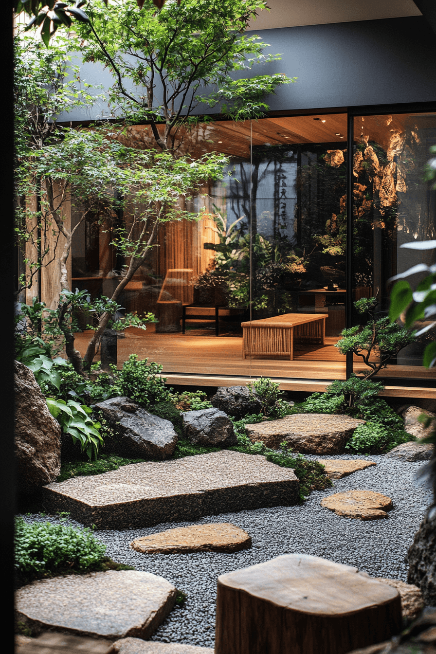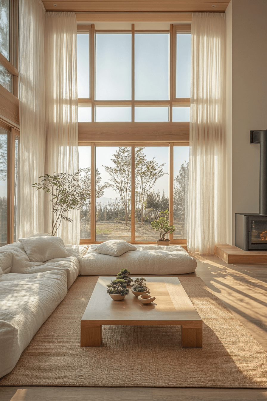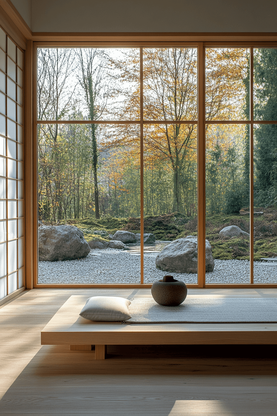 A Scandinavian Japanese interior meditation space radiates mindfulness and gentle stillness. Neutral tones, natural fabrics, and minimalist furniture create an atmosphere where peace flows freely. A single focal element like a bonsai or Zen stone garden adds meaning without clutter. Soft daylight spills through sheer curtains, encouraging reflection and calm.