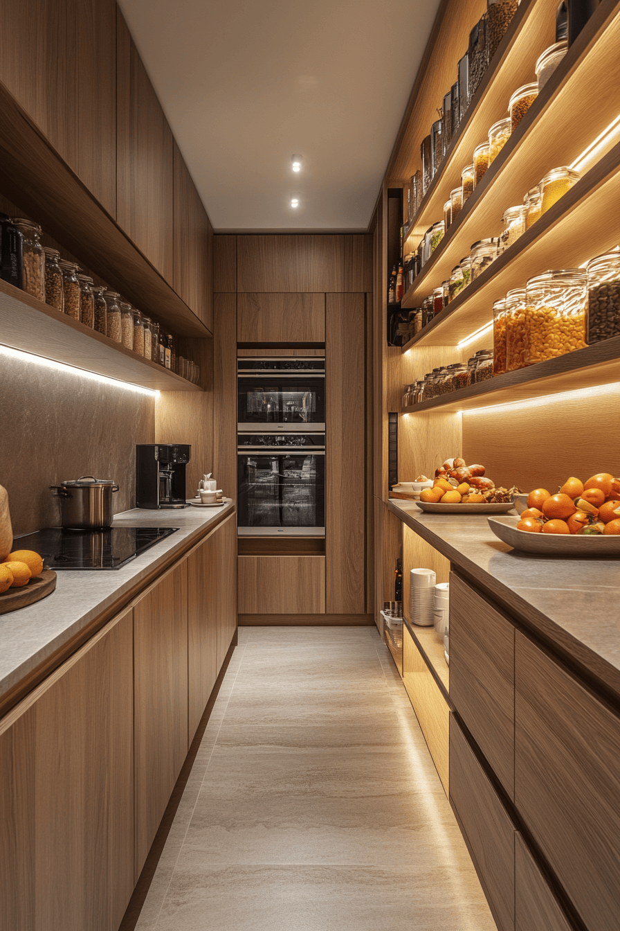The pantry reflects the effortless organization and purity of a Scandinavian Japanese interior. Built-in shelves and clear labeling keep essentials both accessible and stylish. Light wood tones and minimal clutter create a fresh, inspiring look. Every detail feels intentional, blending practicality with aesthetic simplicity.