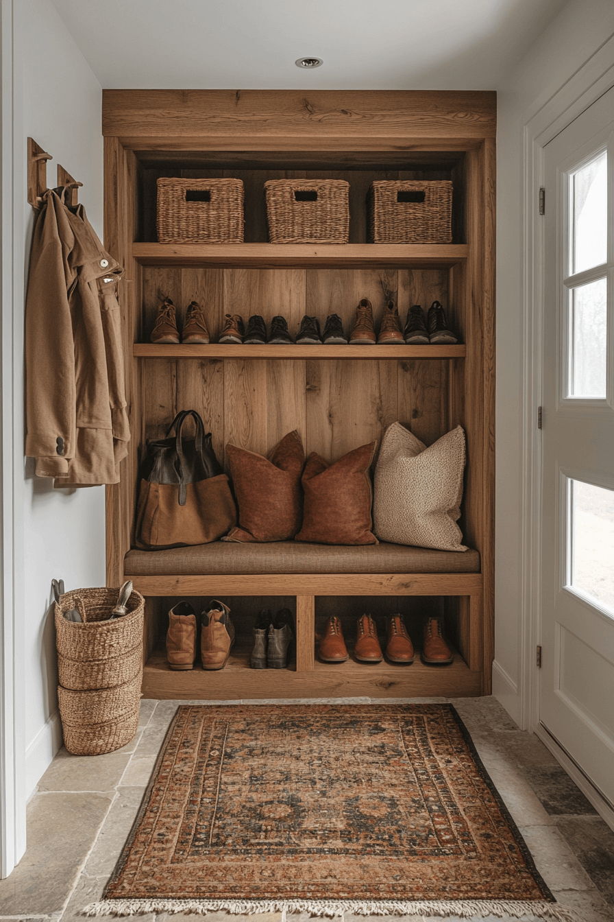 This mudroom combines form and function with a clean Scandinavian Japanese interior aesthetic. Built-in benches, hooks, and open storage keep everything orderly while feeling warm and natural. Light wood tones brighten the space, turning organization into art. Every corner feels purposeful and calm.