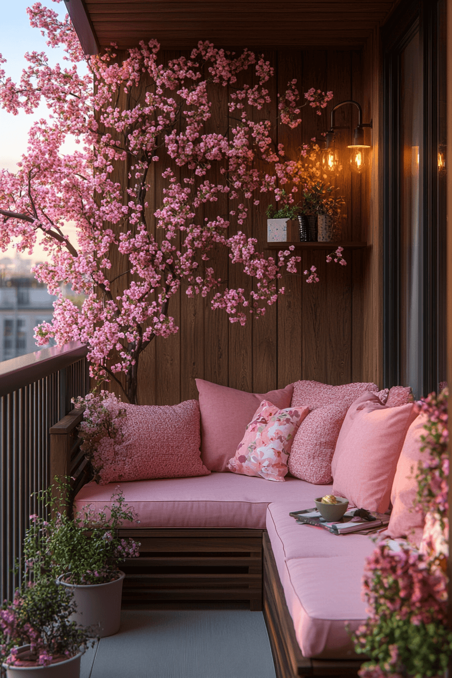 The balcony blossoms with gentle charm, showcasing a Scandinavian Japanese interior approach to outdoor tranquility. Cherry blossom tones and minimalist furniture create a harmonious retreat above the city. Simple planters and soft lighting enhance the cozy, dreamy mood. It’s a peaceful corner to unwind and reconnect with nature.