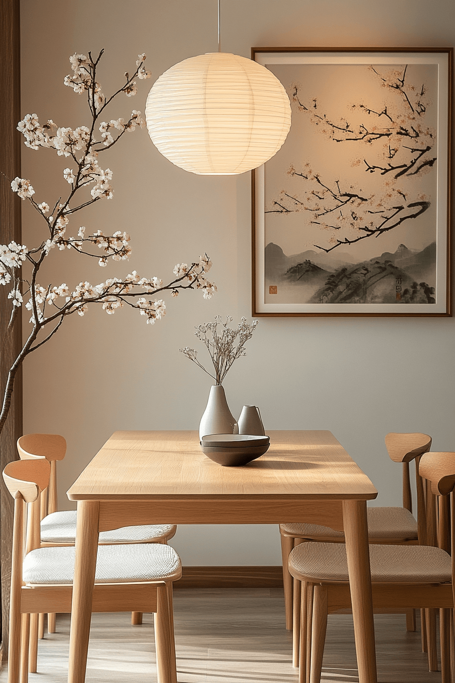 In this dining room, the Scandinavian Japanese interior comes to life through graceful simplicity and subtle color harmony. Pale wood furniture and delicate sakura pink accents infuse the space with both warmth and elegance. Light bounces gently off natural textures, creating an open and airy ambiance. Every meal feels like a moment of calm mindfulness surrounded by beauty.