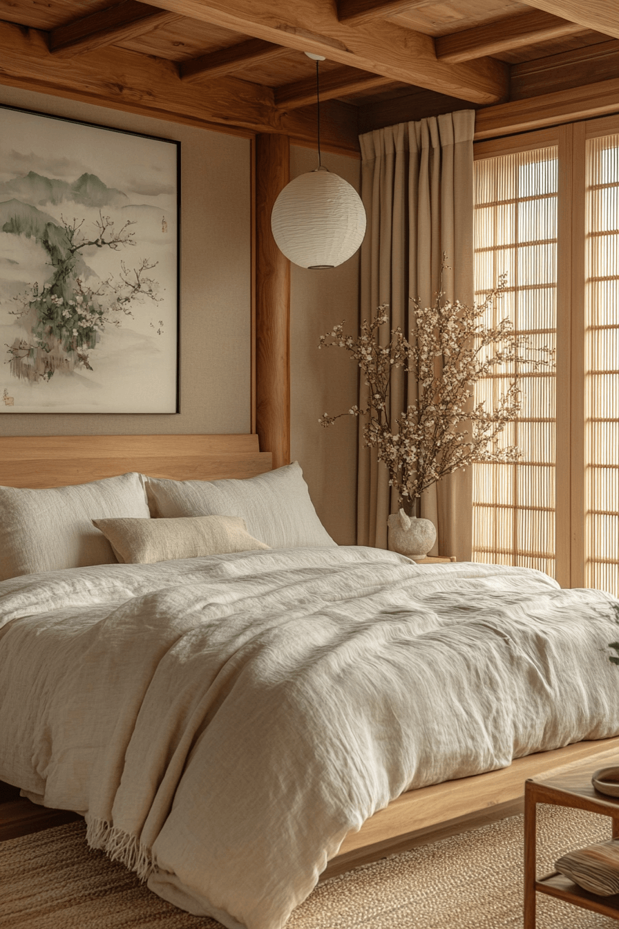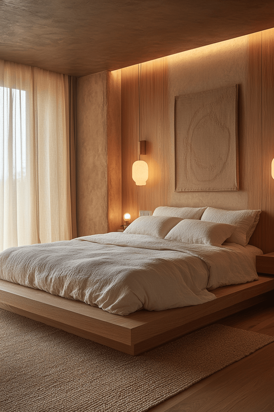 The master bedroom glows with the tranquil essence of a Scandinavian Japanese interior, blending calm energy with timeless elegance. Muted tones, warm wood, and natural textures create a cocoon of peace and comfort. Streamlined furniture and soft lighting help promote restorative rest and serenity. Every element whispers balance and beauty, turning simplicity into luxury.