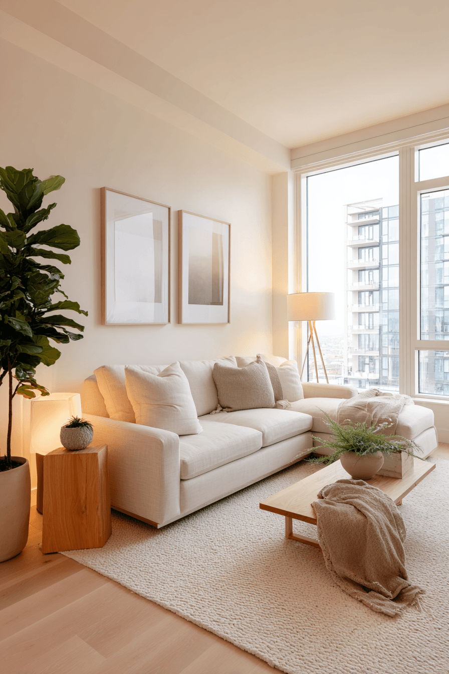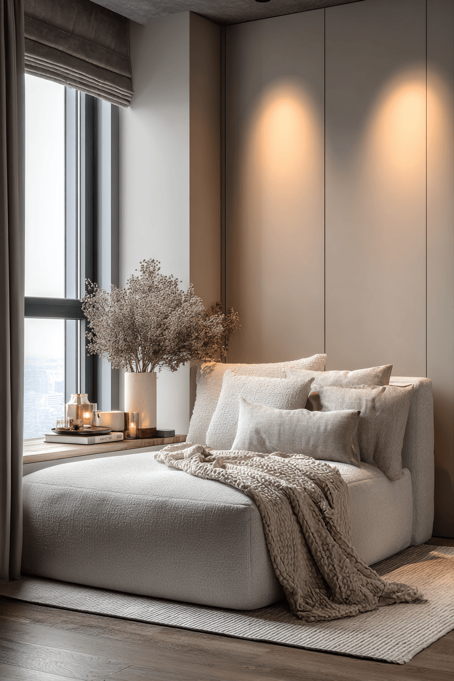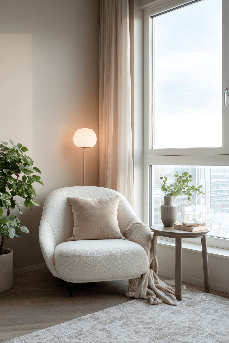 An urban calm corner creates a peaceful escape within a busy environment by reducing visual clutter and noise. Soft tones, minimal decor, and simple furniture help establish a sense of calm. This small apartment inspiration focuses on creating a quiet, restorative zone within a compact layout. Natural materials like wood or stone add grounding warmth. A comfortable chair or small seating area encourages relaxation. Gentle lighting enhances the soothing atmosphere without overpowering it. The mood is serene, grounded, and deeply calming. Explore how to create your calm corner.