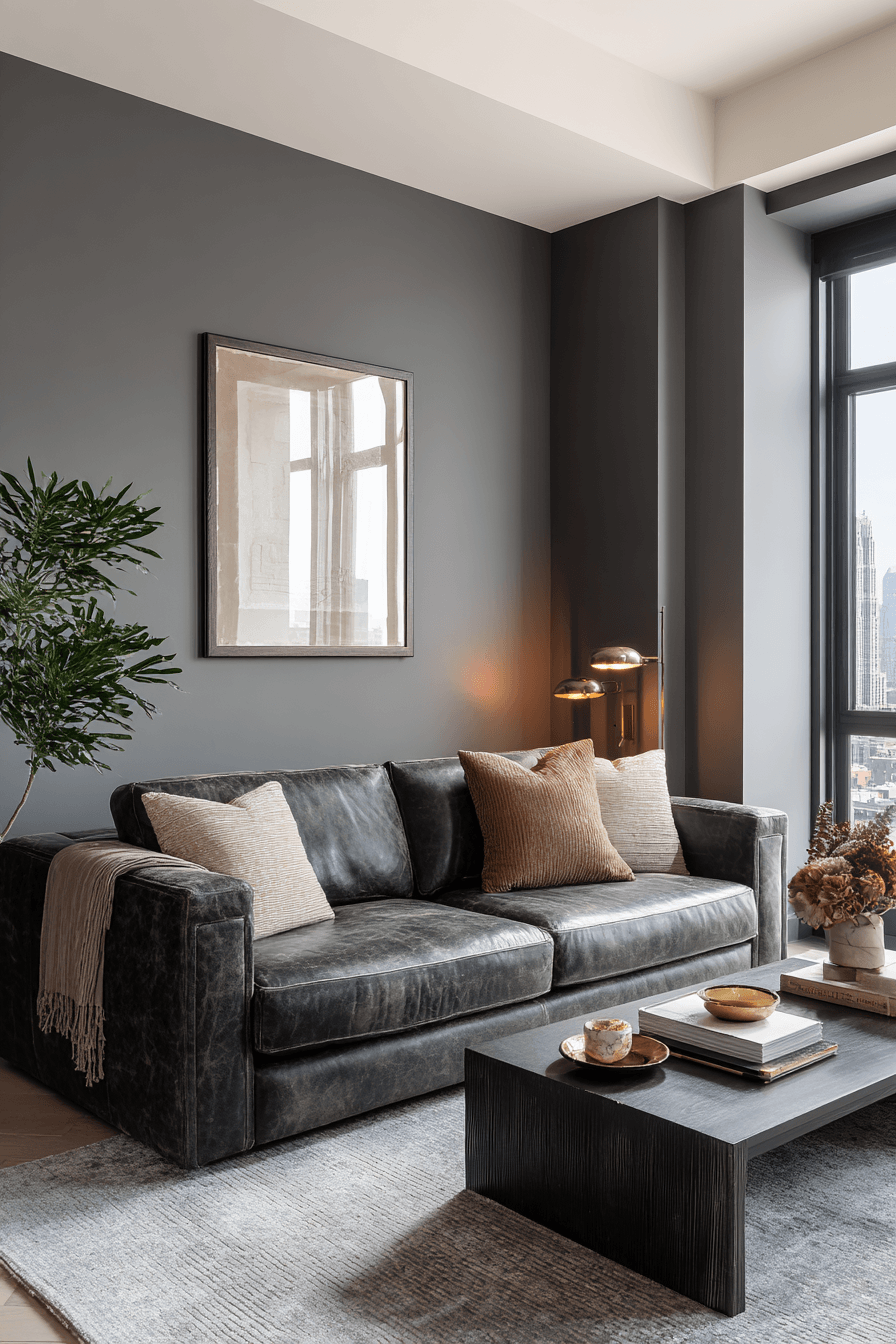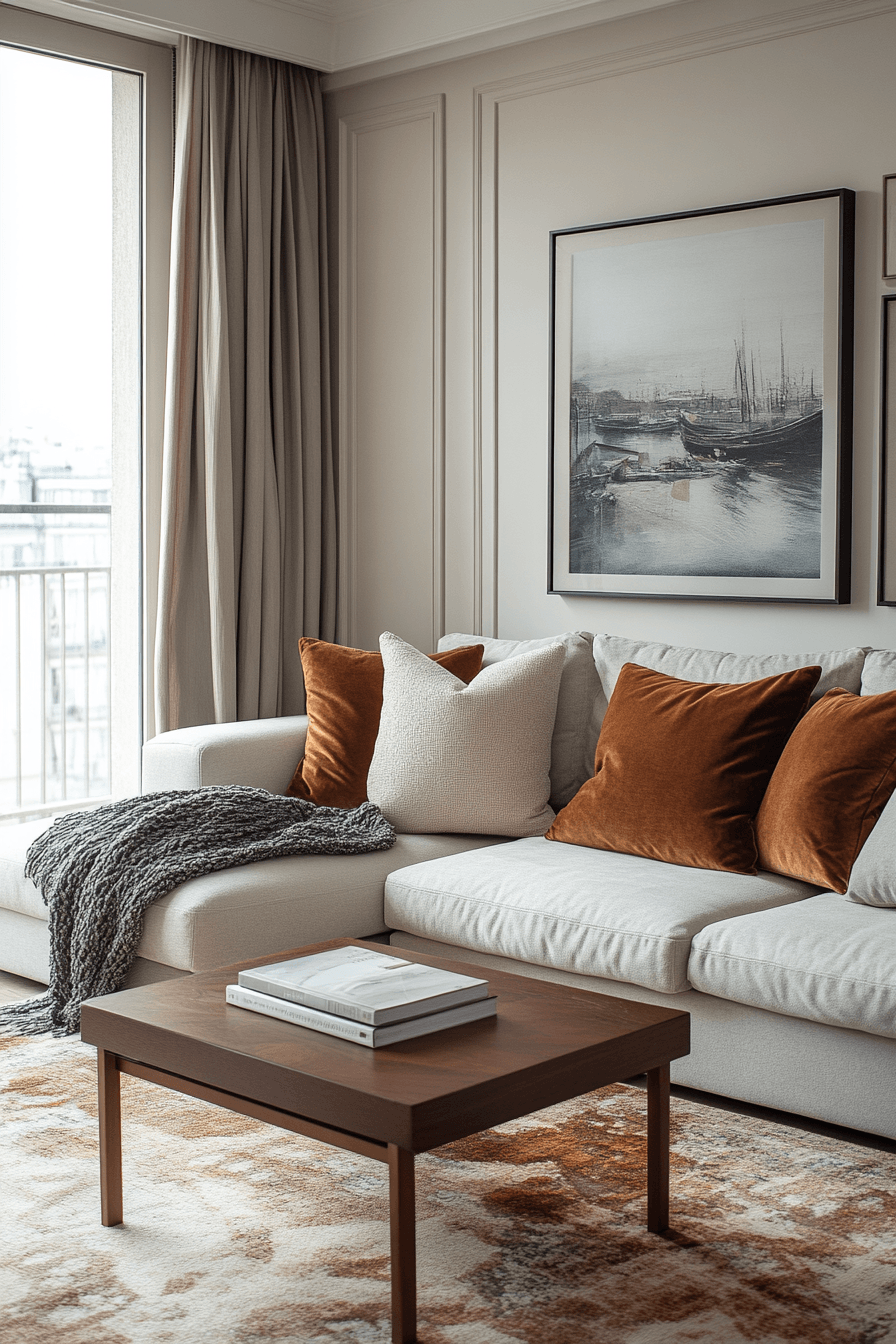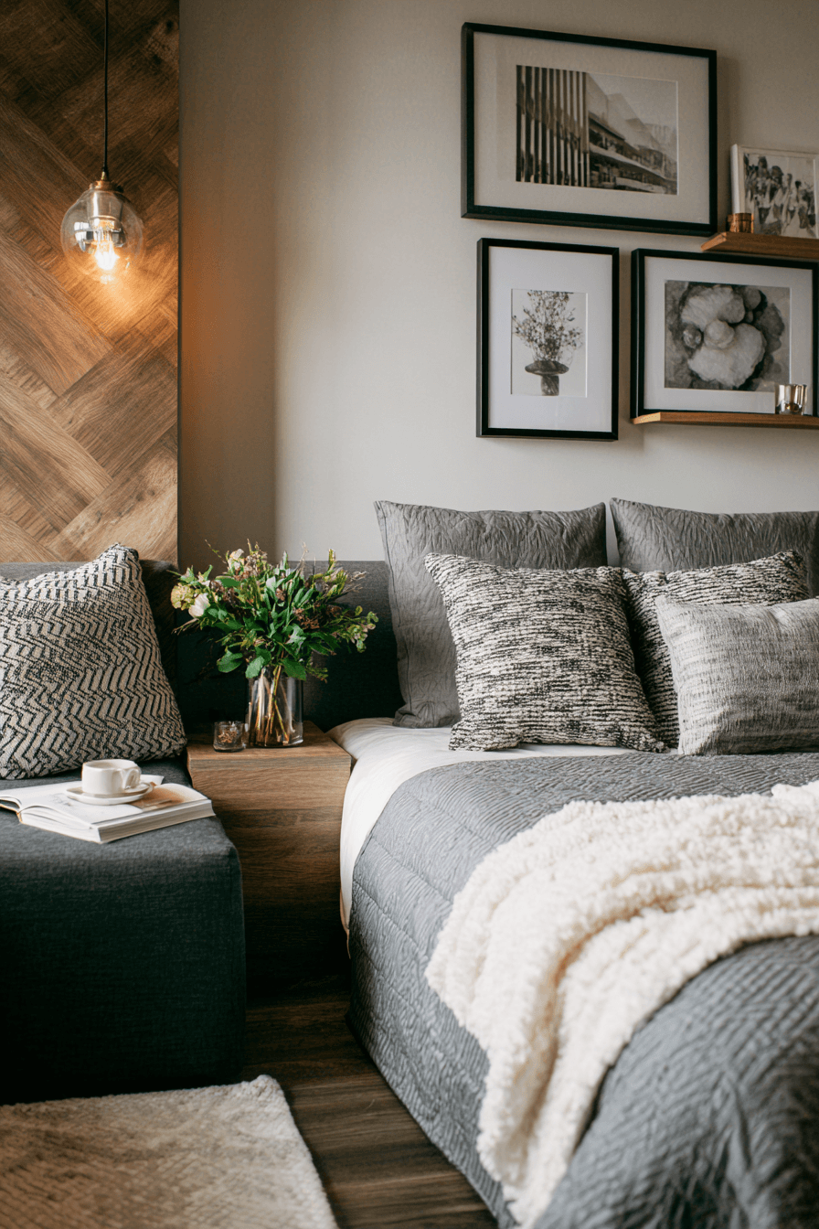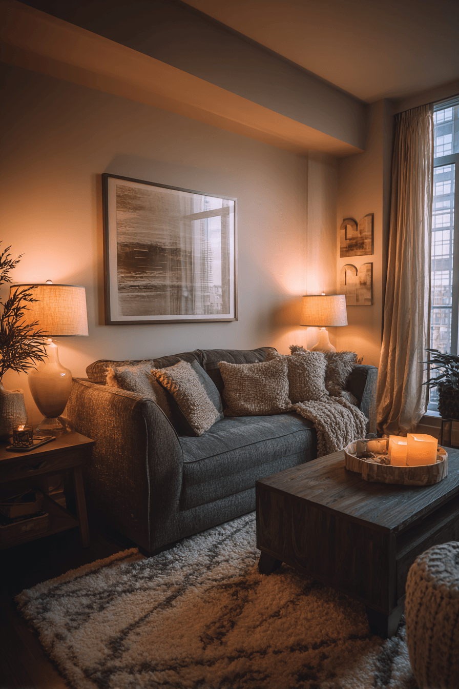 A cozy city retreat wraps the space in warm tones, plush textures, and inviting lighting. Soft fabrics, layered rugs, and compact furniture create comfort without crowding the layout. This small apartment inspiration works beautifully by balancing coziness with smart spatial planning. Ambient lighting from table lamps or sconces adds a gentle glow throughout the space. Rich wood accents and tactile materials bring depth and personality. Strategic furniture placement encourages relaxation while maintaining flow. The vibe feels intimate, layered, and effortlessly stylish. Tap to explore this cozy city look.
