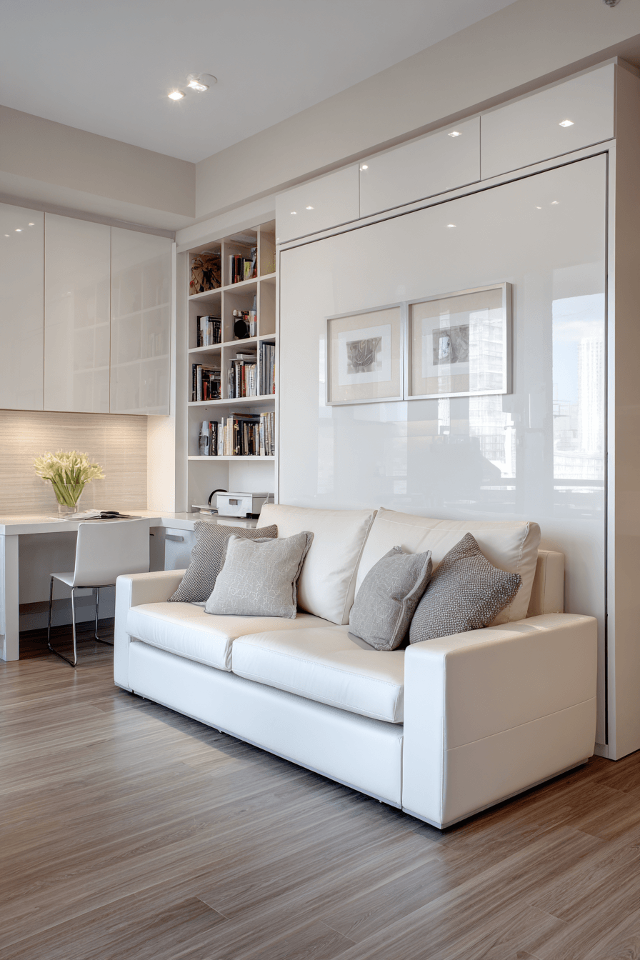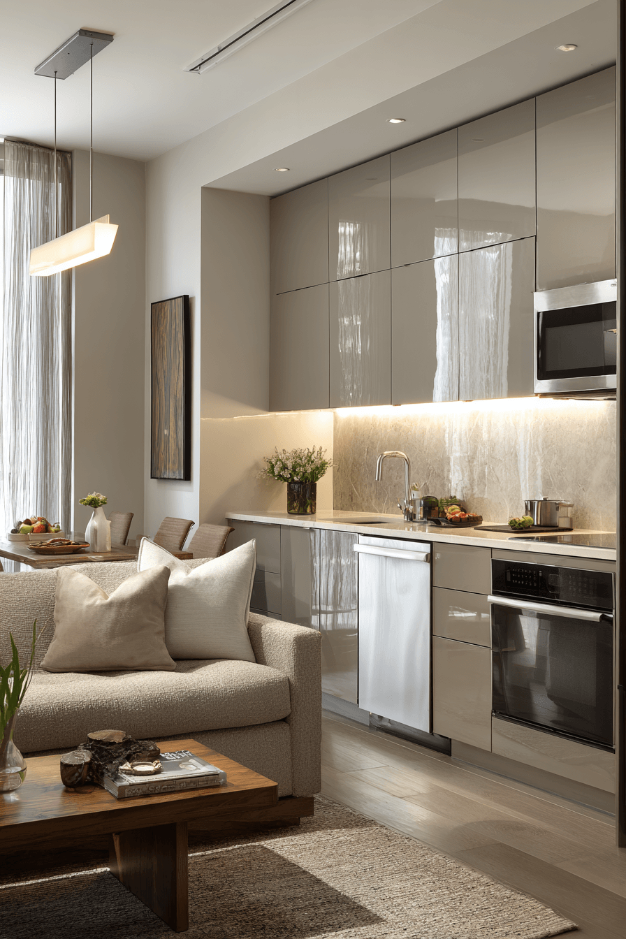 Sleek studio living focuses on polished surfaces and streamlined furniture to maximize space. Glossy finishes and metallic accents reflect light, adding a sense of openness. This small apartment inspiration proves that simplicity can feel sophisticated and refined. Built-in storage and multi-use pieces keep everything functional without visual clutter. A limited color palette enhances cohesion across the entire space. Strategic lighting highlights surfaces and adds subtle dimension. The mood is modern, sharp, and quietly luxurious. Discover how to create a sleek studio vibe.