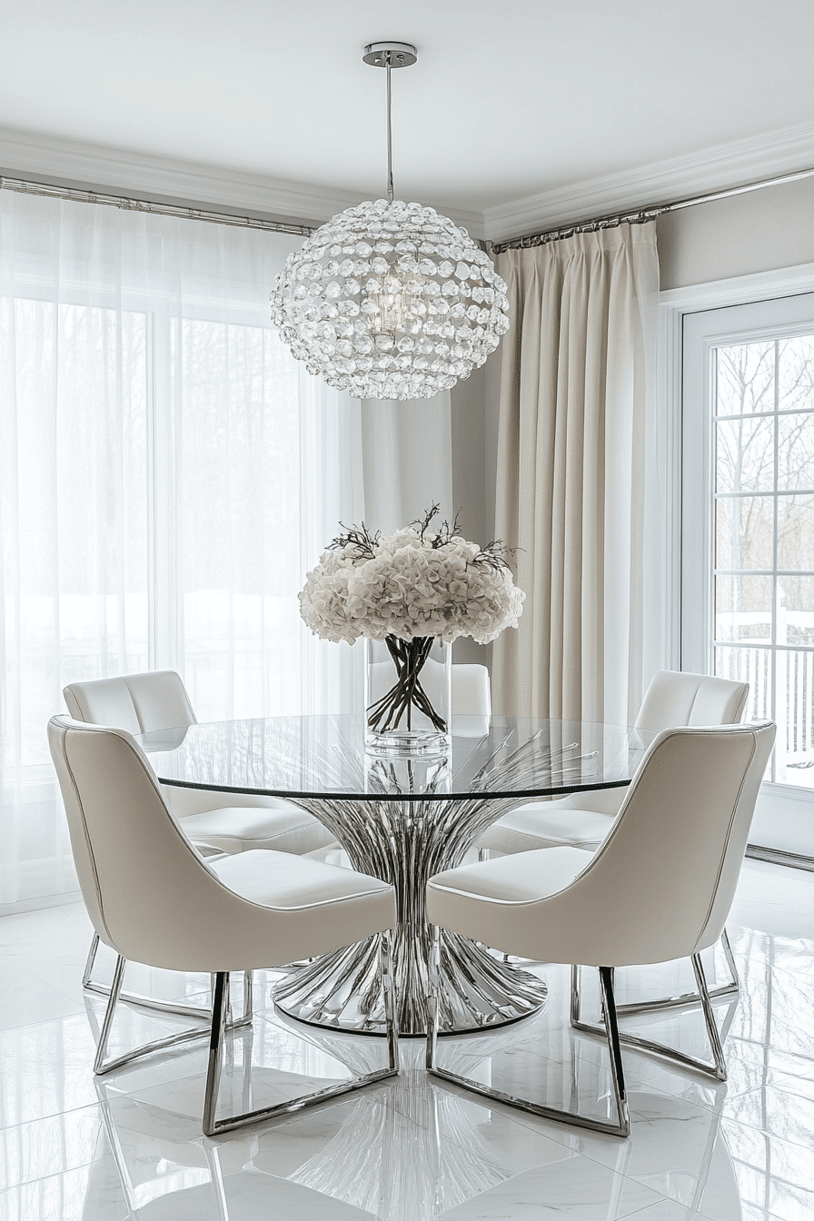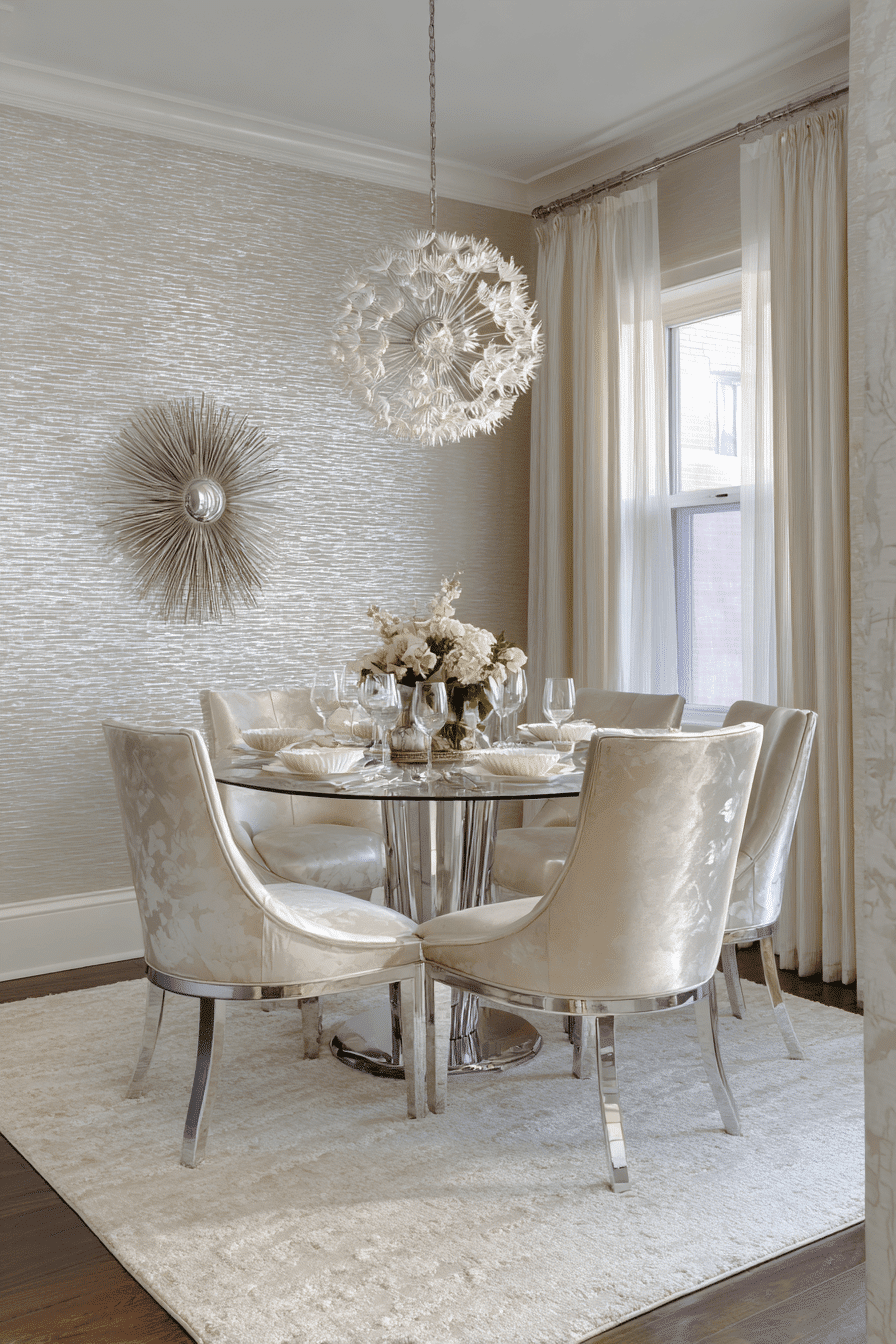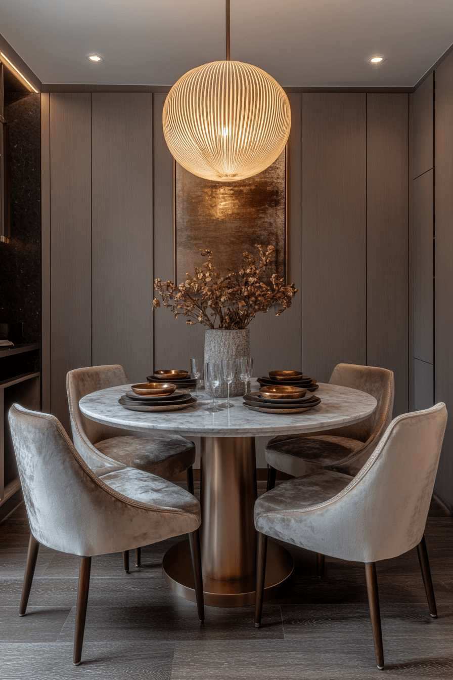 Soft pearl-like finishes and delicate shimmer give this dining area a subtle touch of glamour. The materials feel refined without being flashy, creating an elegant atmosphere. A small round table with plush seating completes the look. Gentle lighting enhances the overall softness. These small dining room ideas are perfect for understated luxury. Add a hint of shimmer and elevate your dining experience.