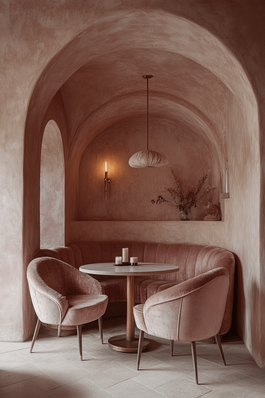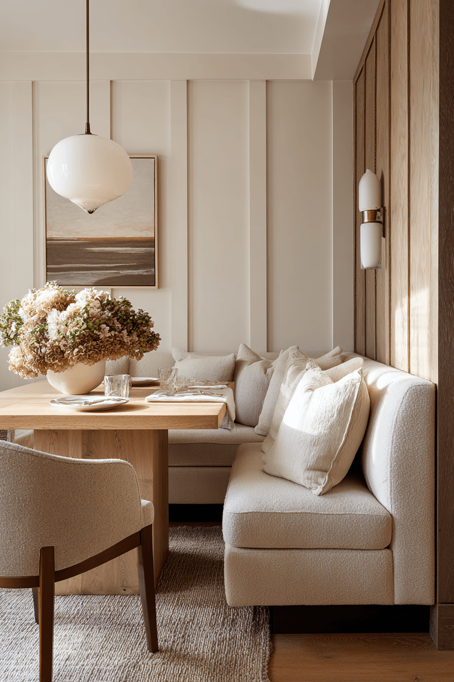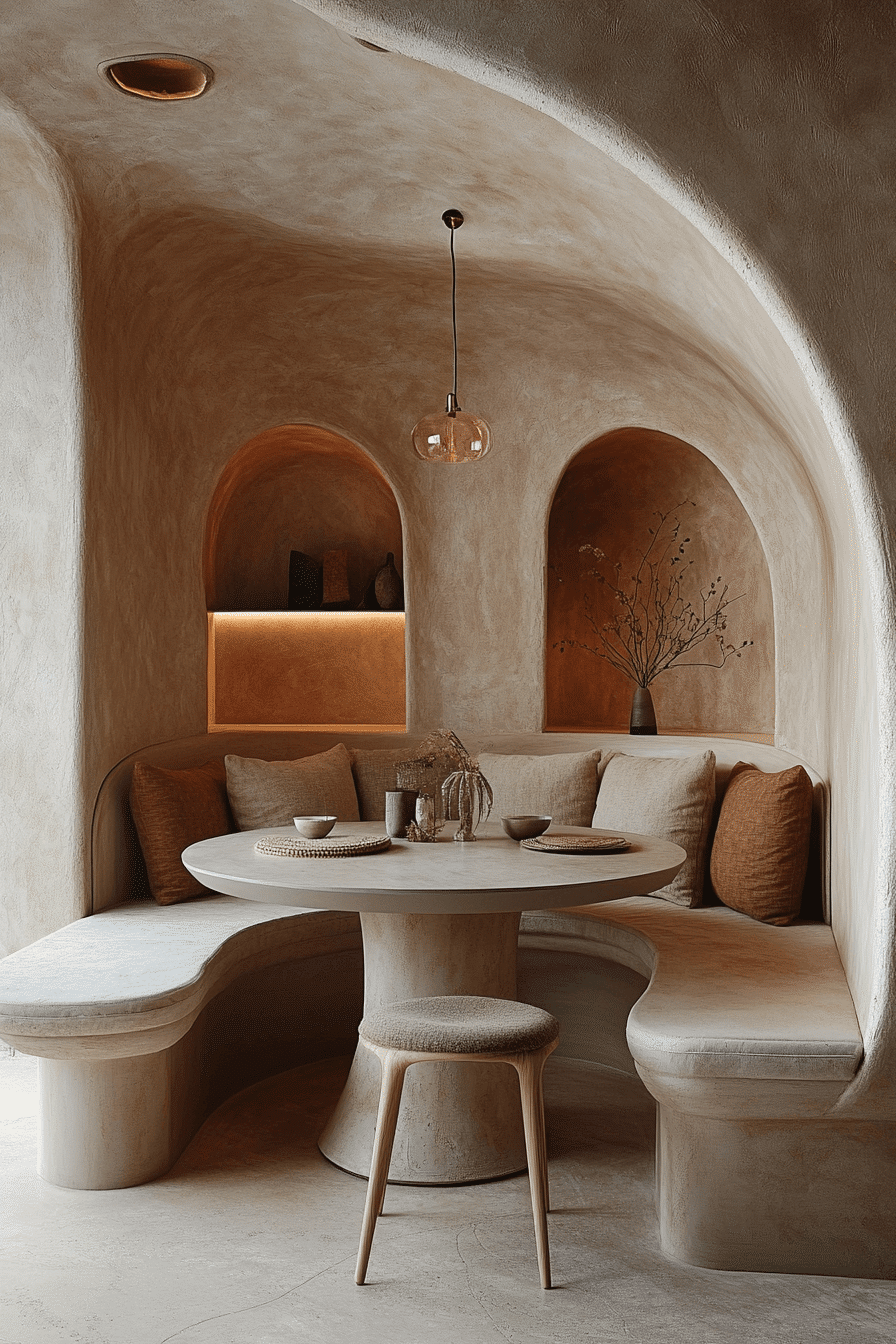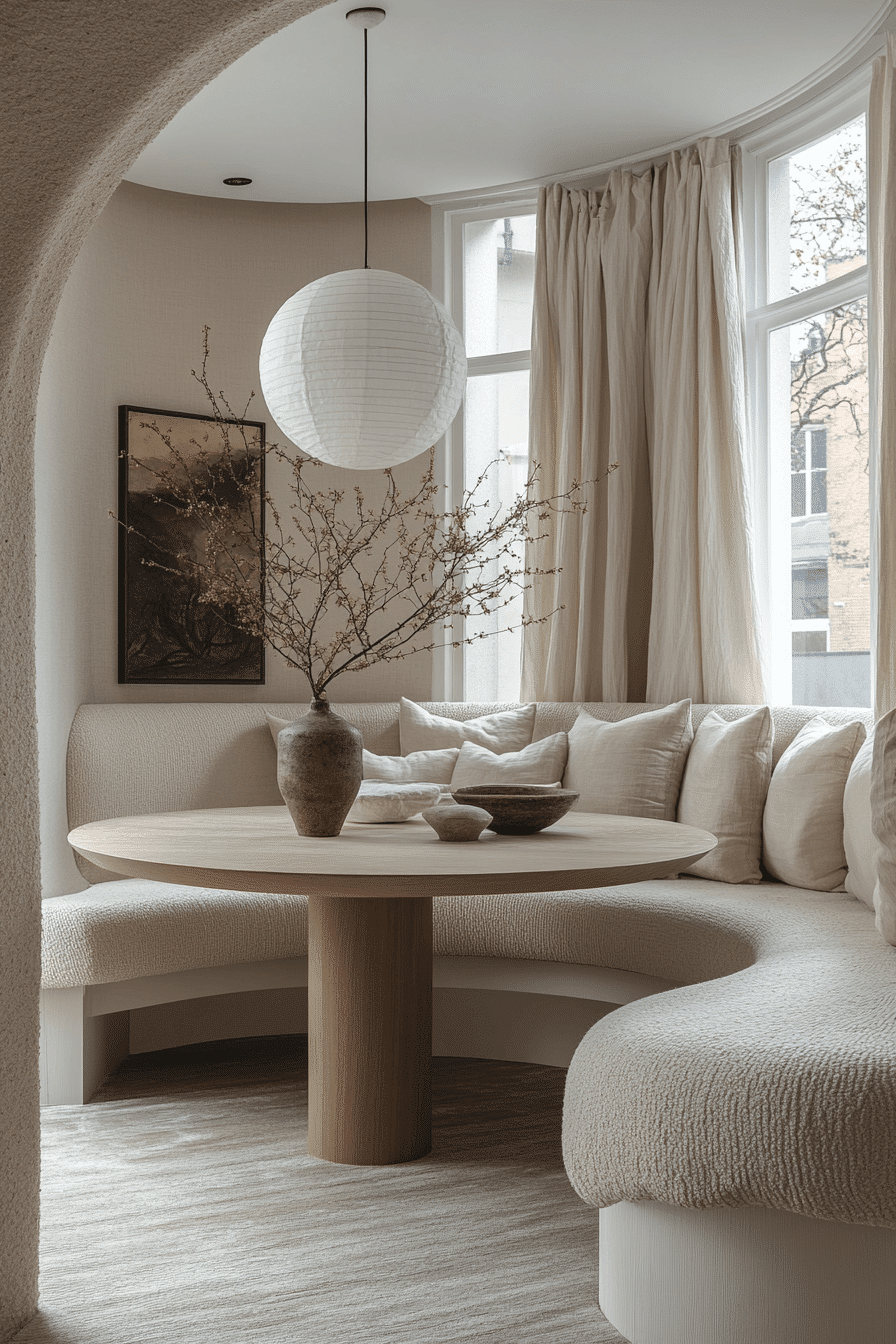 A soft cream palette wraps this space in warmth, creating a seamless and inviting atmosphere. Layered textures and curved furniture shapes give it a cozy, cocoon-like feel. A petite table with plush seating maximizes comfort without overwhelming the layout. Subtle lighting enhances the soothing tones throughout. This approach to small dining room ideas is ideal for comfort-driven design lovers. Discover how to bring this calming aesthetic into your home.