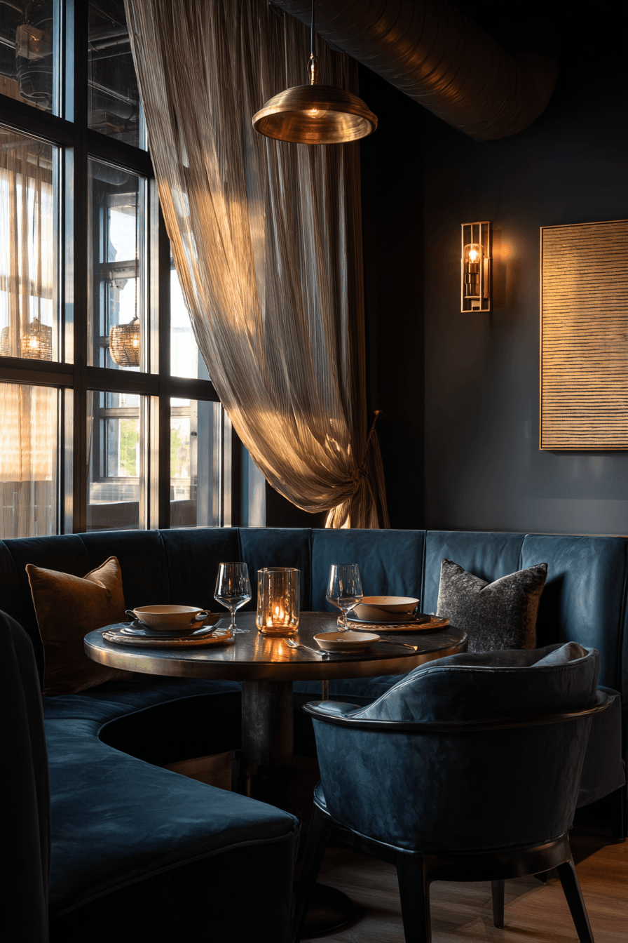 This setup embraces refined elegance in a compact footprint, pairing velvet seating with gold-accented tableware and a chic round marble table. Reflective surfaces and metallic touches enhance brightness without crowding the space. The arrangement feels intentional and polished while remaining practical. Soft textures and ambient lighting create a cozy, intimate atmosphere. It’s a beautiful example of how small dining room ideas can still feel luxurious. Explore how to recreate this elevated look in your own space.