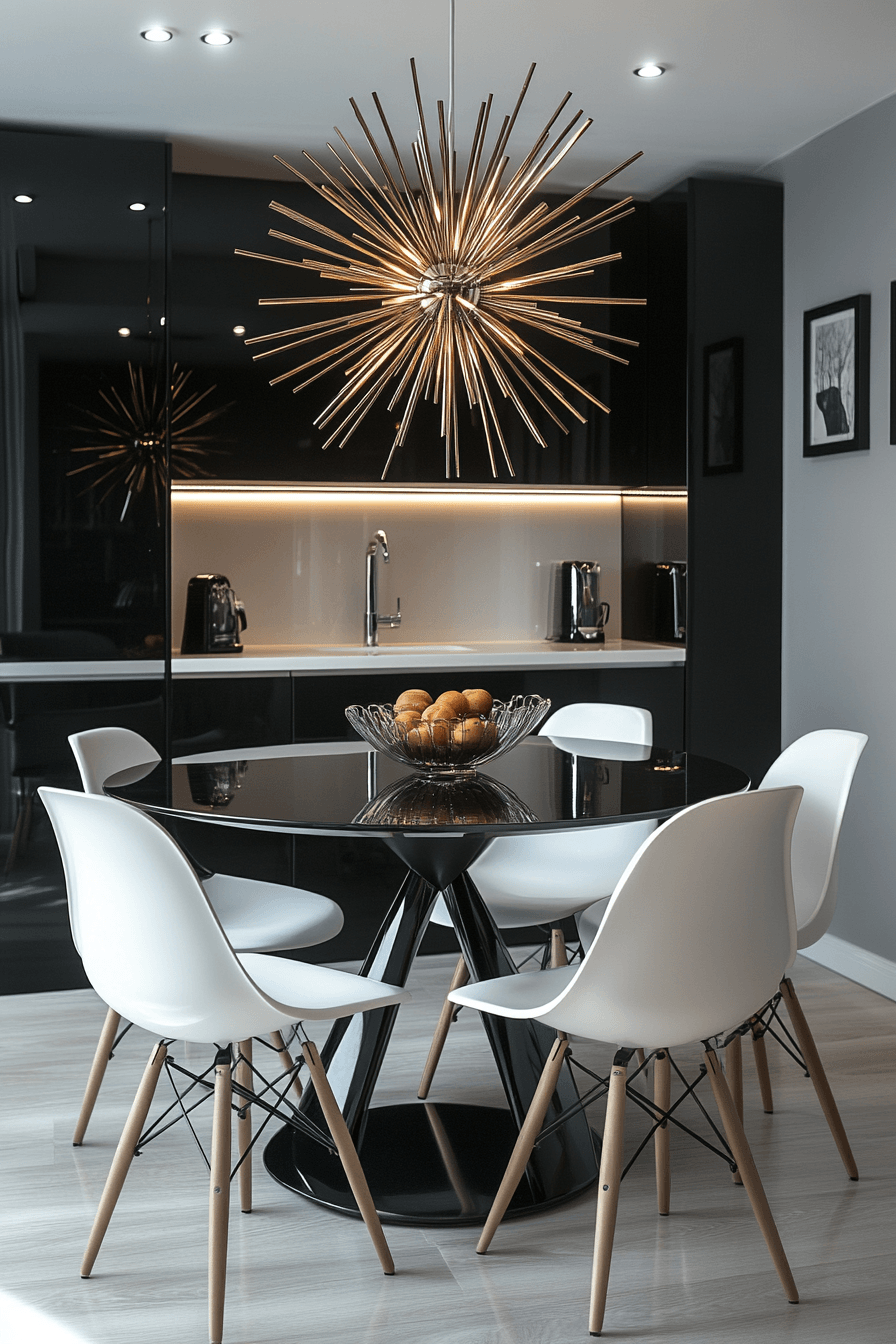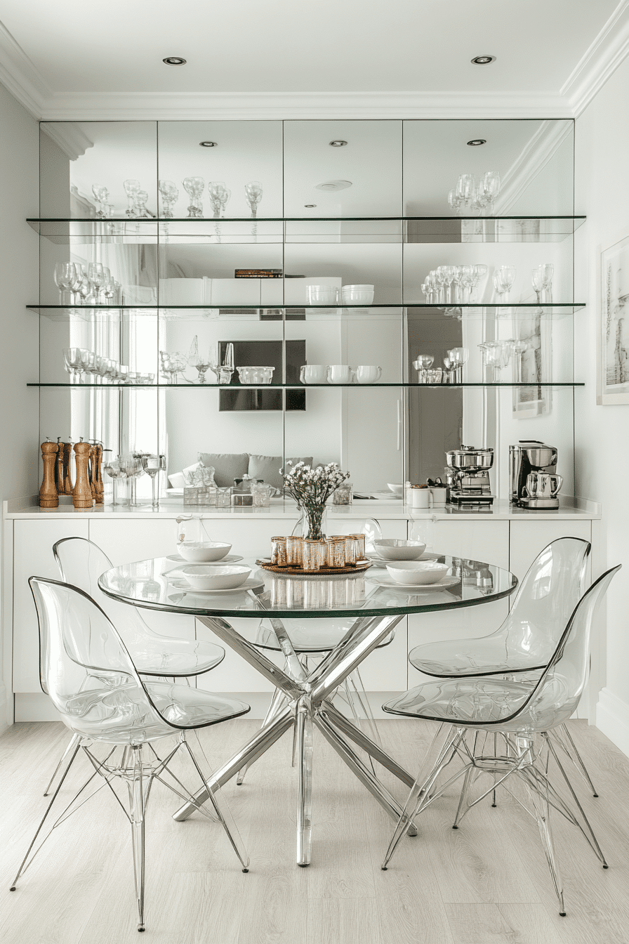 A modern mix of style and practicality defines this open and airy dining setup. Floating shelves, transparent furniture, and uncluttered layouts keep the room feeling spacious. A monochrome palette ties everything together for a clean, cohesive look. Every piece serves a clear function while contributing to the design. These small dining room ideas are sleek, efficient, and visually appealing. Refresh your space with this polished approach.
