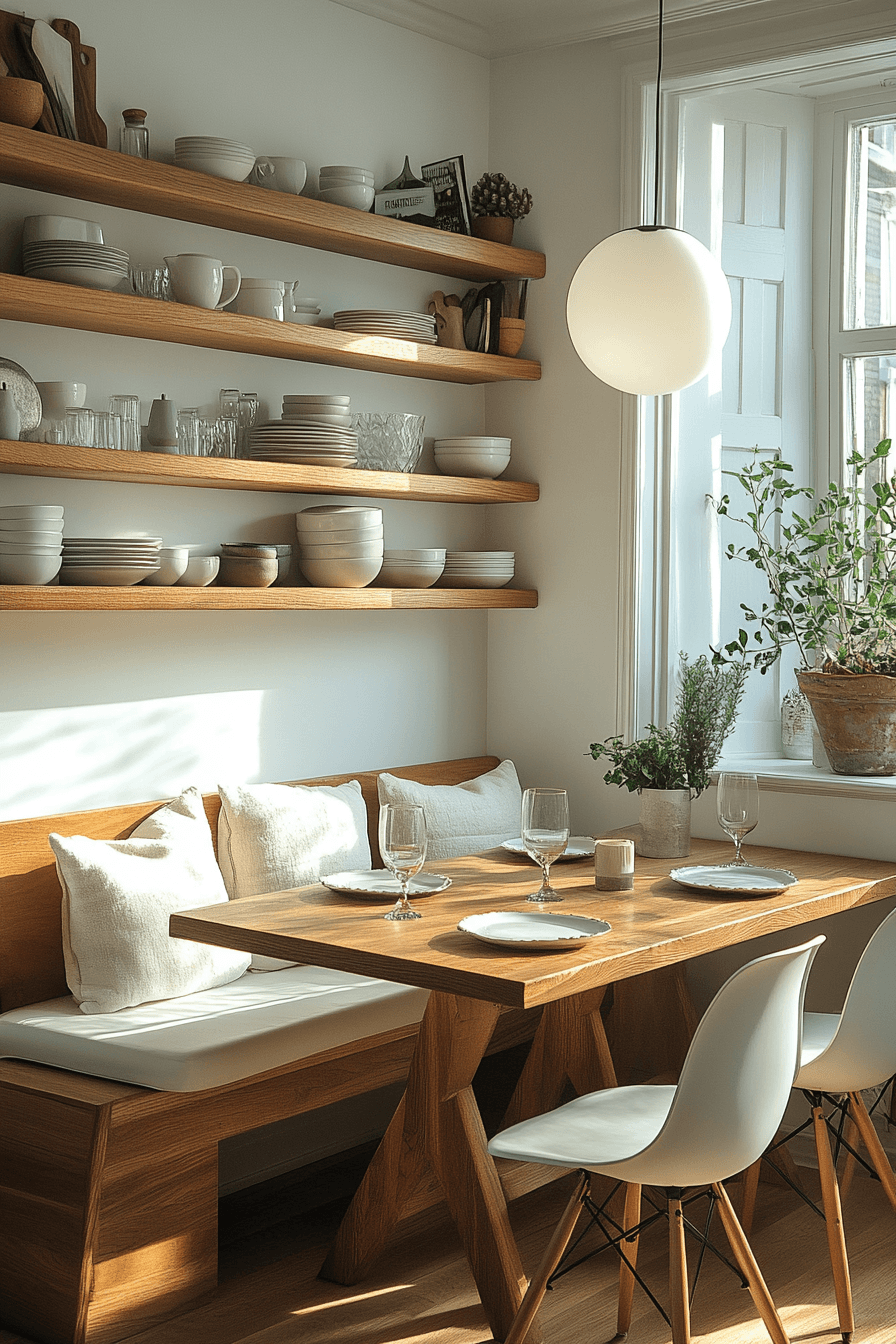 A streamlined table tucked neatly into a corner helps maximize every bit of floor space. Clean lines and neutral tones keep the design sharp and organized. The layout creates a cozy, tucked-away setting perfect for intimate meals. Lighting remains simple and focused to enhance the area. These small dining room ideas are ideal for compact homes or studios. Discover how to make corners work beautifully for you.