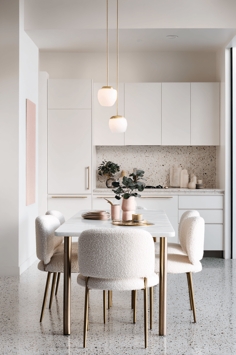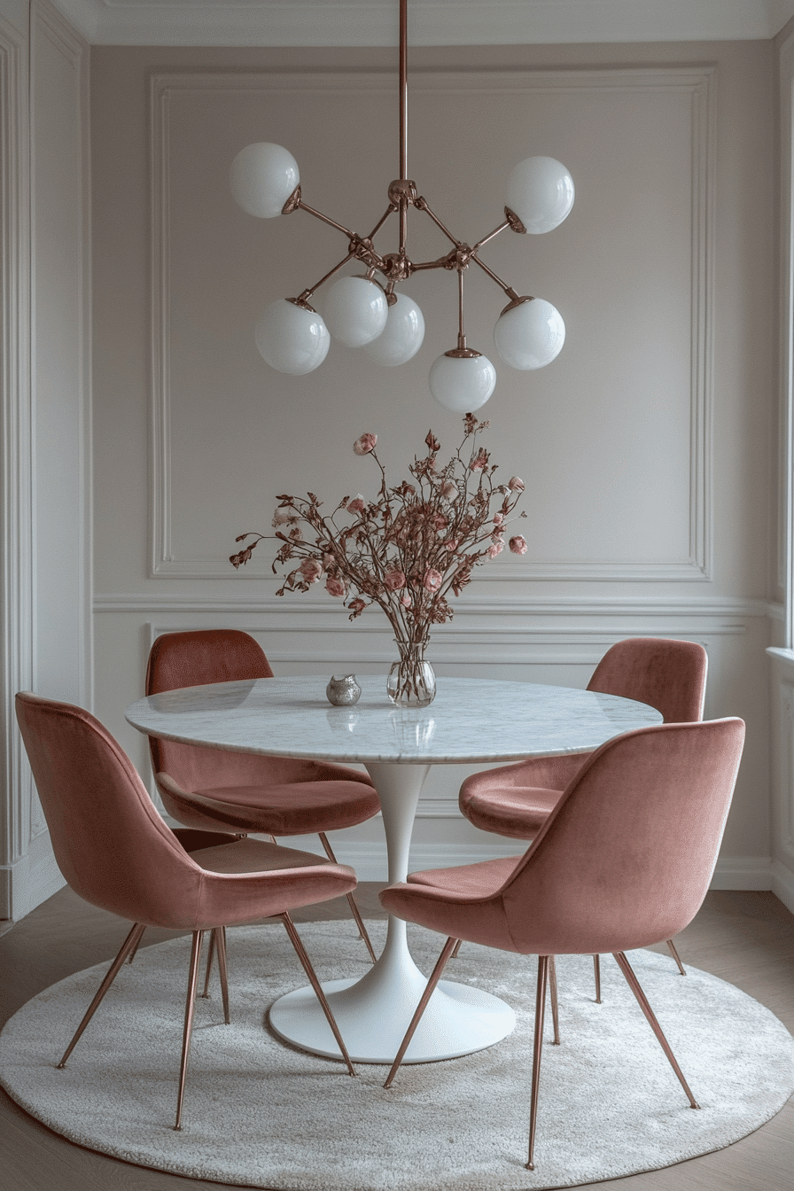A soft blush palette combined with marble accents creates a refined yet welcoming feel. The gentle tones add elegance without becoming overpowering. A compact marble-top table acts as a stylish focal point. Coordinated seating in gold or white keeps the design cohesive. This version of small dining room ideas feels both delicate and sophisticated. Bring this chic blush-inspired look into your dining space.