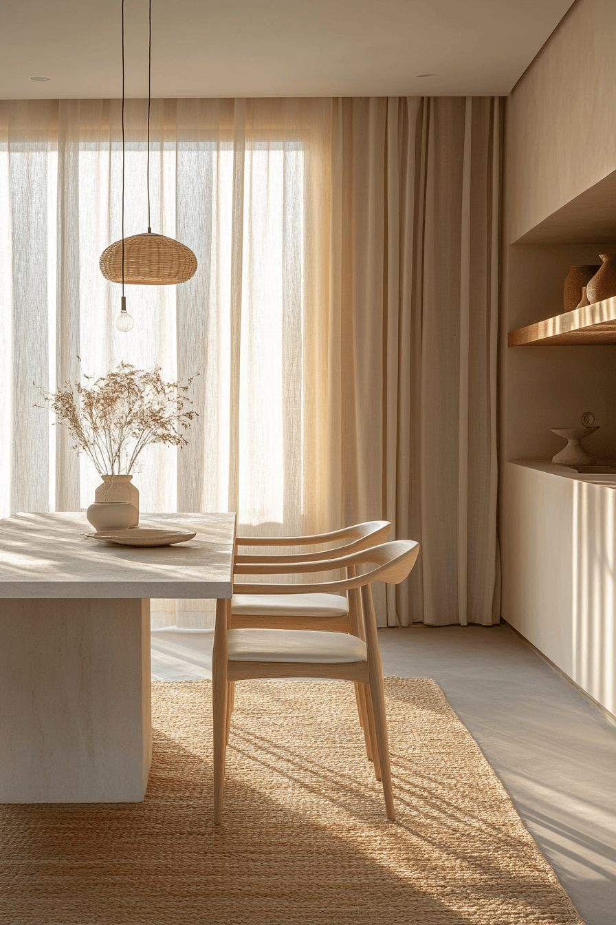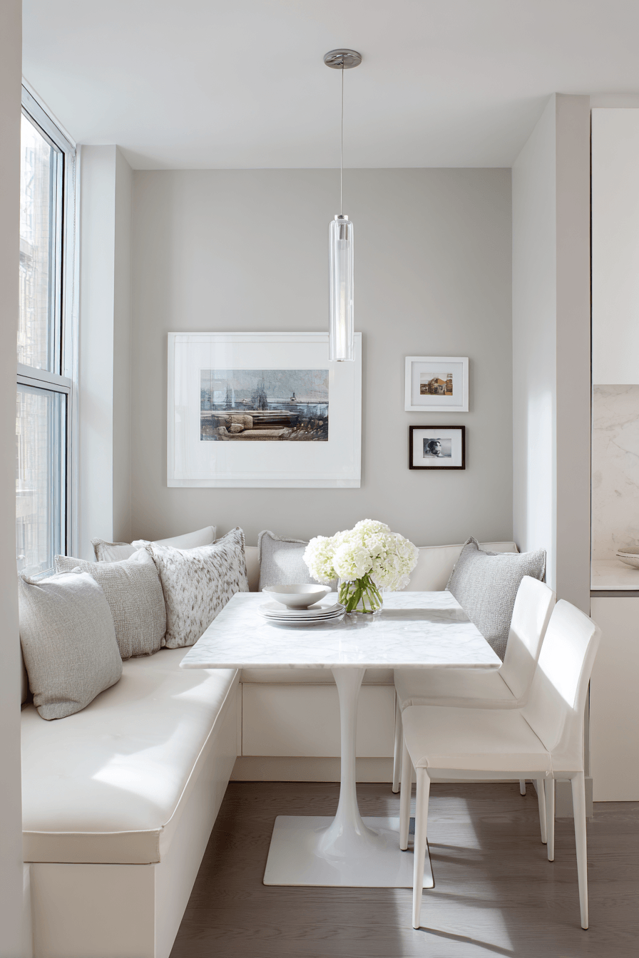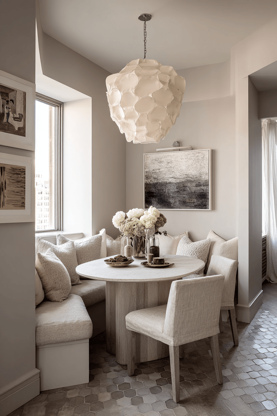 Soft tones like white, beige, and gray wrap the room in a peaceful, airy ambiance. The light color scheme visually expands the space and keeps it feeling fresh. Natural textures such as linen and wood introduce warmth and comfort. Carefully spaced furniture ensures everything feels intentional and uncluttered. This take on small dining room ideas is both calming and inviting. Start designing your own serene dining corner today.