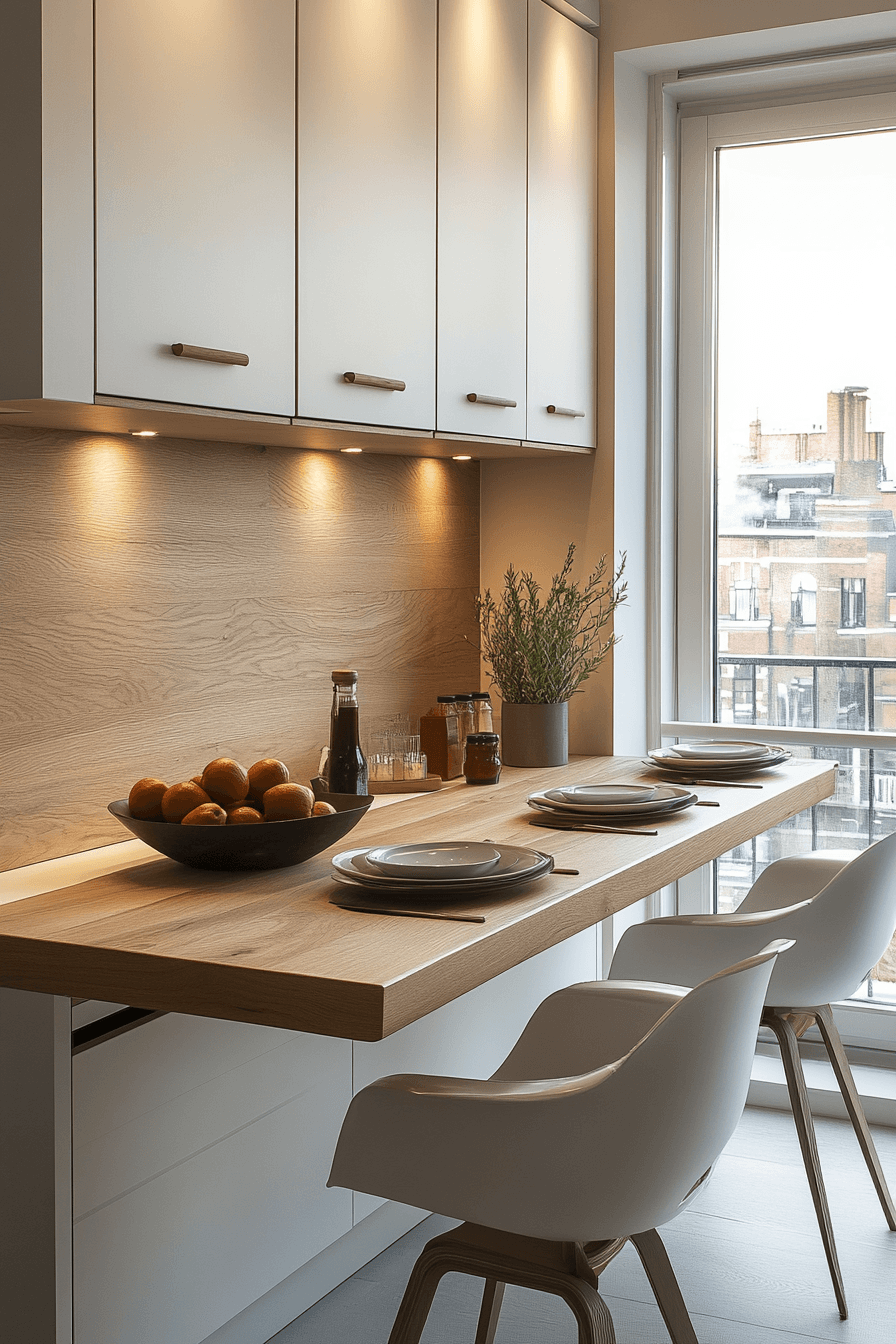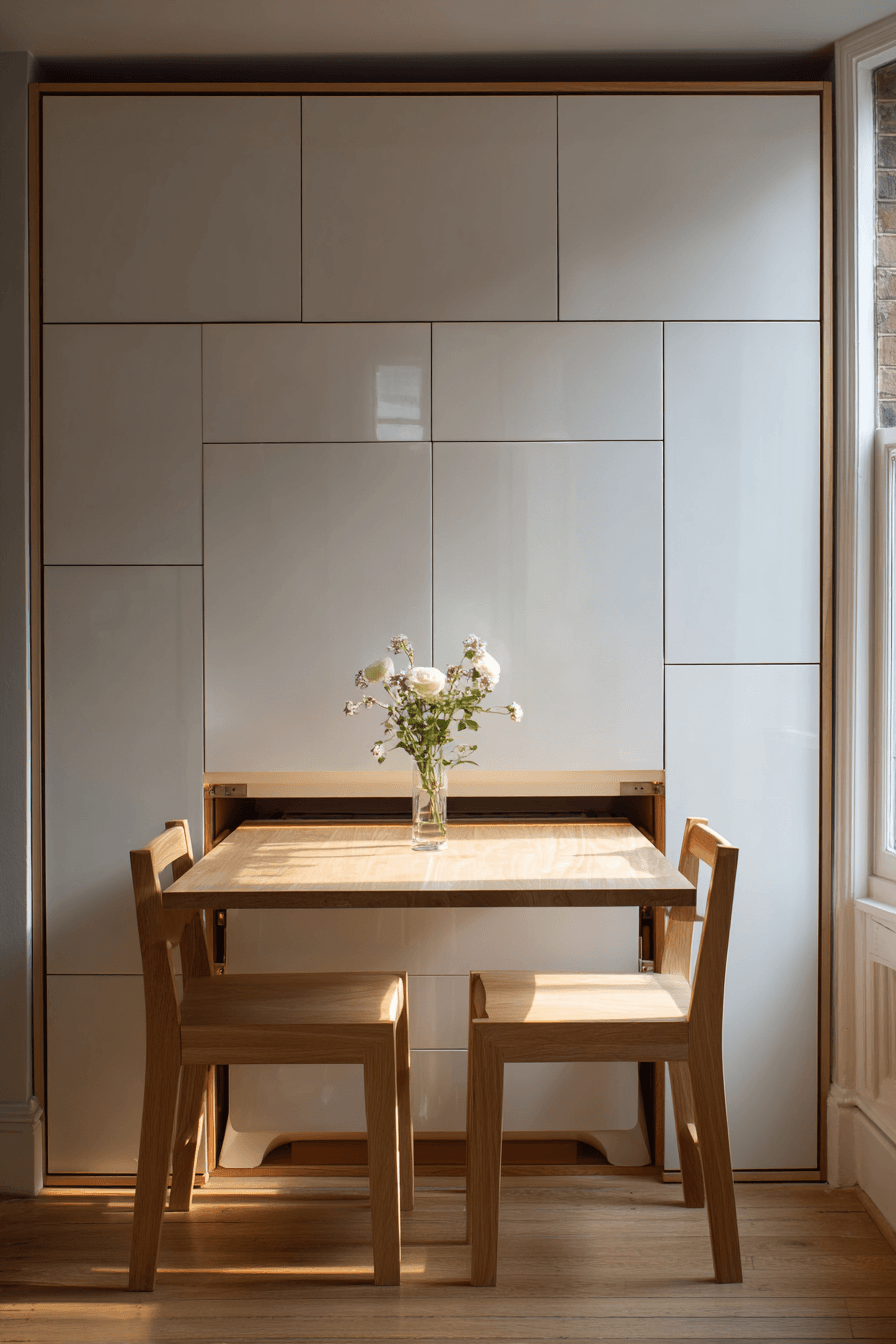 A wall-mounted table paired with collapsible chairs offers a flexible and space-saving solution. When not in use, everything folds away to keep the room open and tidy. Smooth finishes like glossy white or soft gray add a modern touch. This setup is perfect for extremely limited square footage. These small dining room ideas make functionality look stylish. Give your space a smart upgrade with this adaptable design.