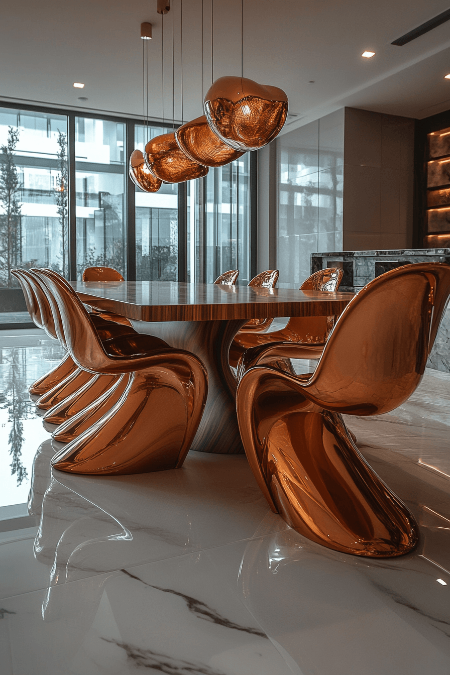 Curved furniture, warm hues, and soft lighting come together to create a cozy, enveloping atmosphere. Rounded shapes flow from the table to the seating, giving the space a gentle, cohesive feel. The design encourages comfort and relaxation during meals. It feels intimate without being cramped. These small dining room ideas are perfect for creating a snug dining retreat. Turn your space into a welcoming haven with this approach.