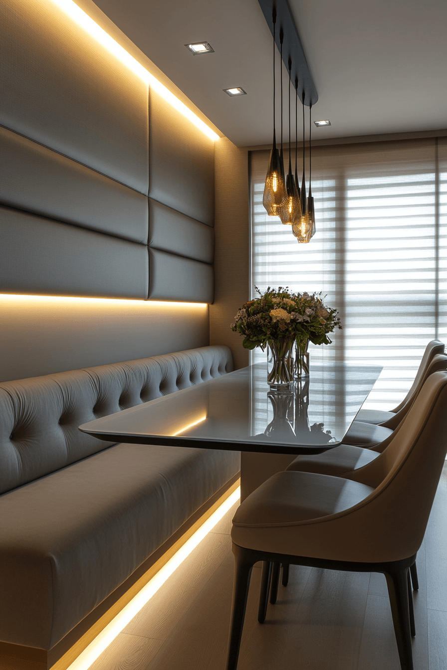 Soft underlighting tucked beneath seating or cabinetry adds a subtle glow that instantly enhances the room. Paired with a gentle color palette, it creates depth and warmth without clutter. A compact booth-style layout keeps everything efficient and close-knit. The overall look feels cozy with a modern twist. These small dining room ideas highlight the power of thoughtful lighting. See how a simple glow can completely transform your dining area.