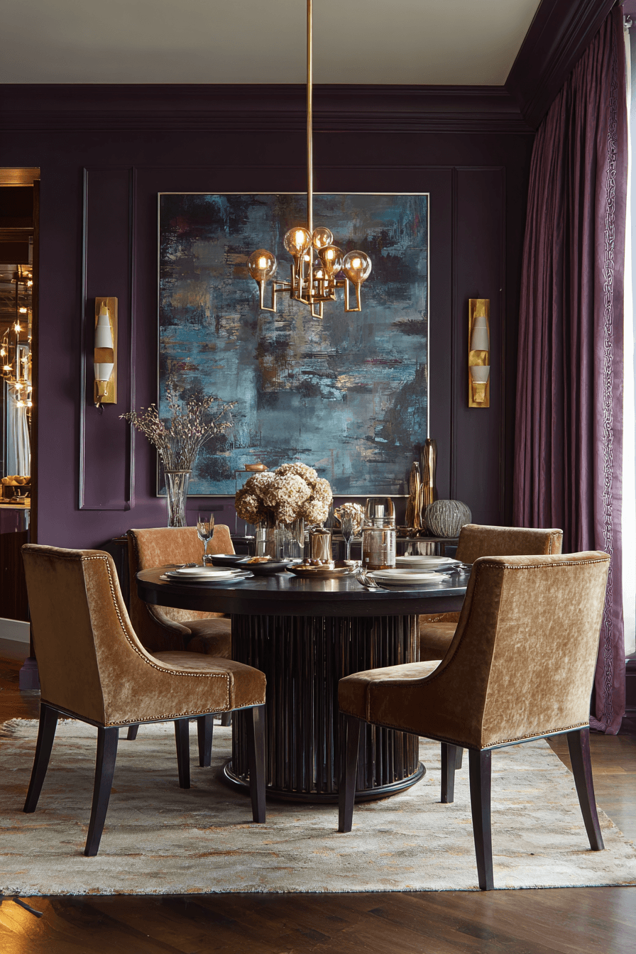 This design blends geometric shapes with soft finishes for a balanced and modern look. Clean angles are softened by rounded elements like rugs or lighting fixtures. The interplay of shapes adds depth without overpowering the room. Neutral colors and gentle textures keep the space harmonious. It’s a creative take on small dining room ideas that feels both stylish and approachable. See how you can incorporate this artistic balance into your dining area.
