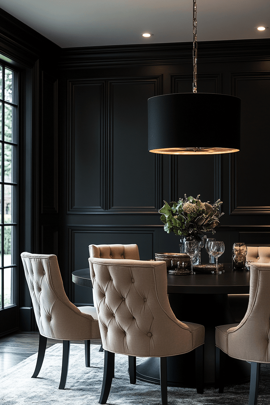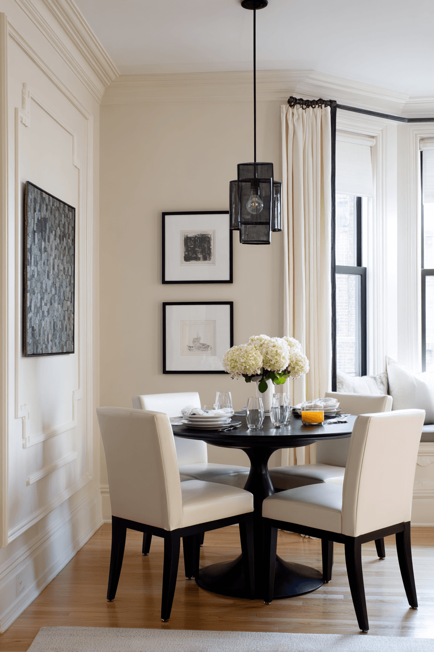 Light walls paired with darker furniture create a striking yet balanced contrast. The brightness keeps the space open, while deeper tones add richness and depth. A dark table surrounded by softer hues becomes a beautiful focal point. The design feels bold but still harmonious. These small dining room ideas play with contrast in a refined way. Try mixing tones to add visual interest to your space.