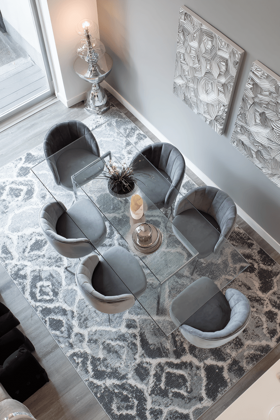 Sleek angles and refined finishes give this dining space a sharp, modern edge. Chrome details, glossy surfaces, and a glass-top table create a polished, upscale feel without overwhelming the room. Clean, focused lighting keeps everything crisp and defined. The design remains minimal while still feeling warm and inviting. These small dining room ideas prove that bold structure can still feel comfortable. Bring this streamlined style into your home and elevate your space.