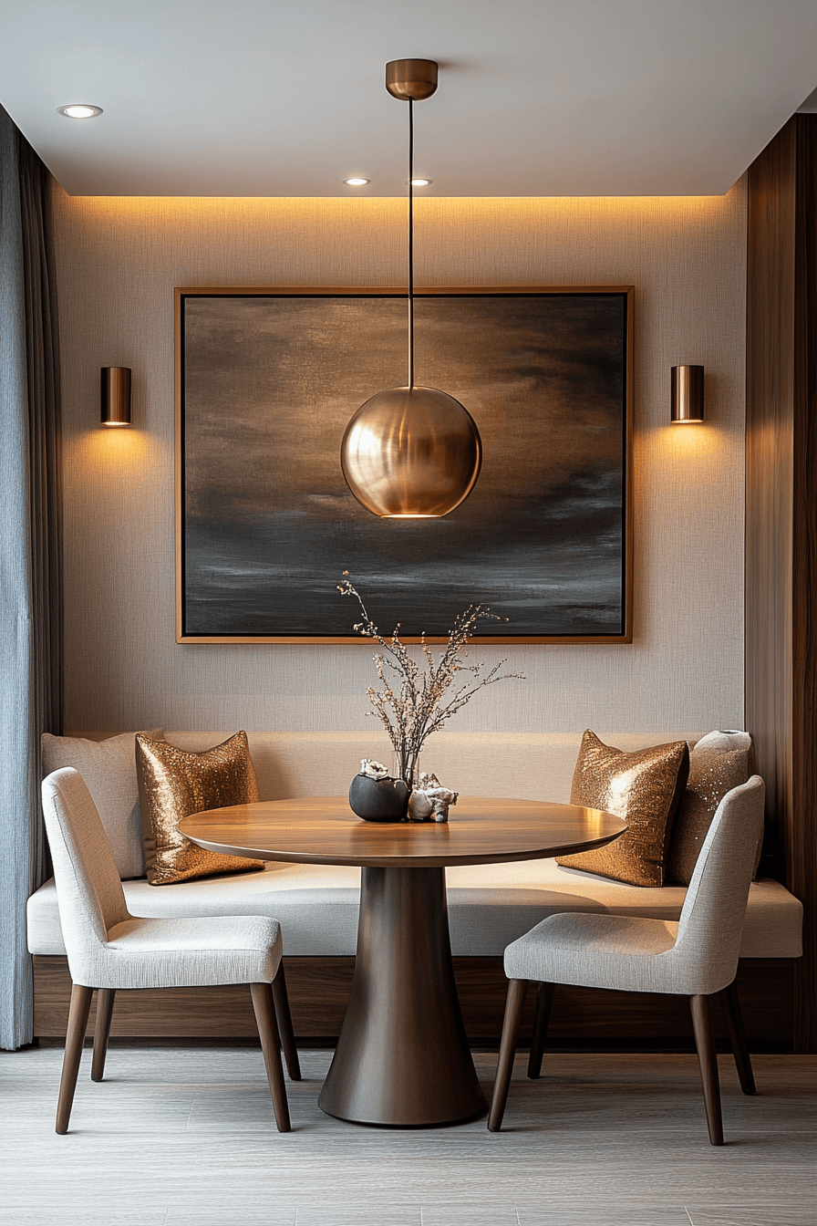 A cozy corner comes to life with warm golden accents and soft lighting that adds a gentle glow. Subtle metallic details provide a hint of glam while maintaining balance. Compact furnishings ensure the space remains functional and intimate. The lighting creates a welcoming ambiance perfect for dining. This is a standout example of small dining room ideas with a touch of elegance. Bring this glowing charm into your space and make every meal feel special.